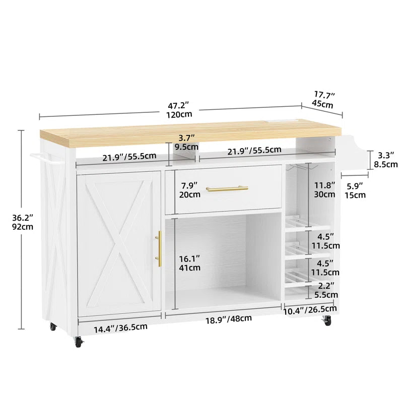 - Multi-Storage Design: Includes a drawer, cabinet, wine rack, goblet holder, towel and spice racks