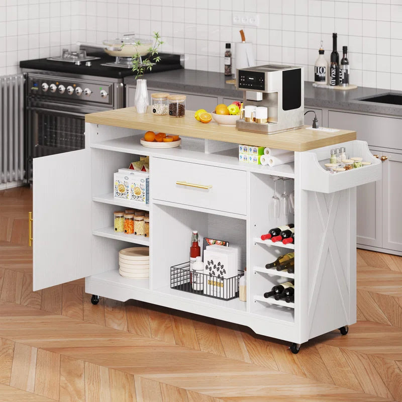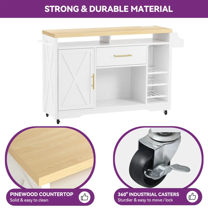 Kitchen Island Table – Multi-Functional Rolling Cart with Pine Top, Drawer, Shelves & Power Outlets