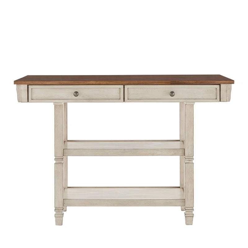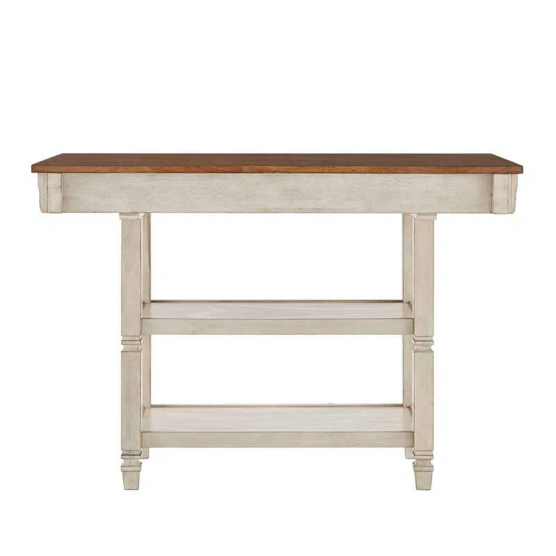 This kitchen island table is a versatile addition to your home, perfect for preparing meals or entertaining guests. Crafted from solid rubberwood, it features a stunning natural oak wood finish that highlights the wood's natural grain. Designed with two open shelves, it provides convenient storage for appliances and utensils. Whether you're hosting a gathering or preparing dinner, this table complements your farmhouse decor while offering ample prep space and easy accessibility.