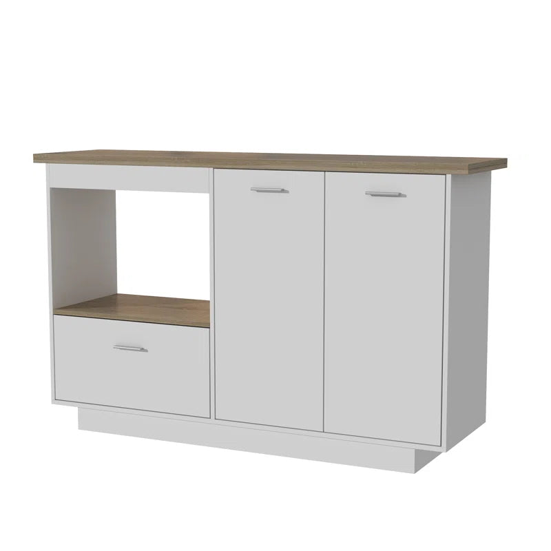 This kitchen island table combines modern charm with smart functionality to enhance your culinary space. Built from a mix of solid and engineered wood, it features a light wood-toned countertop and a white base for a clean, contemporary finish. With one drawer, two doors, and three interior shelves, it offers ample storage for your cookware and pantry items. The drop-leaf design provides additional prep surface when needed, while the UV- and chip-resistant finish ensures lasting durability and elegance.