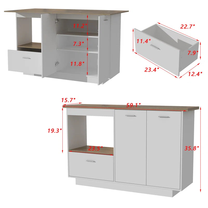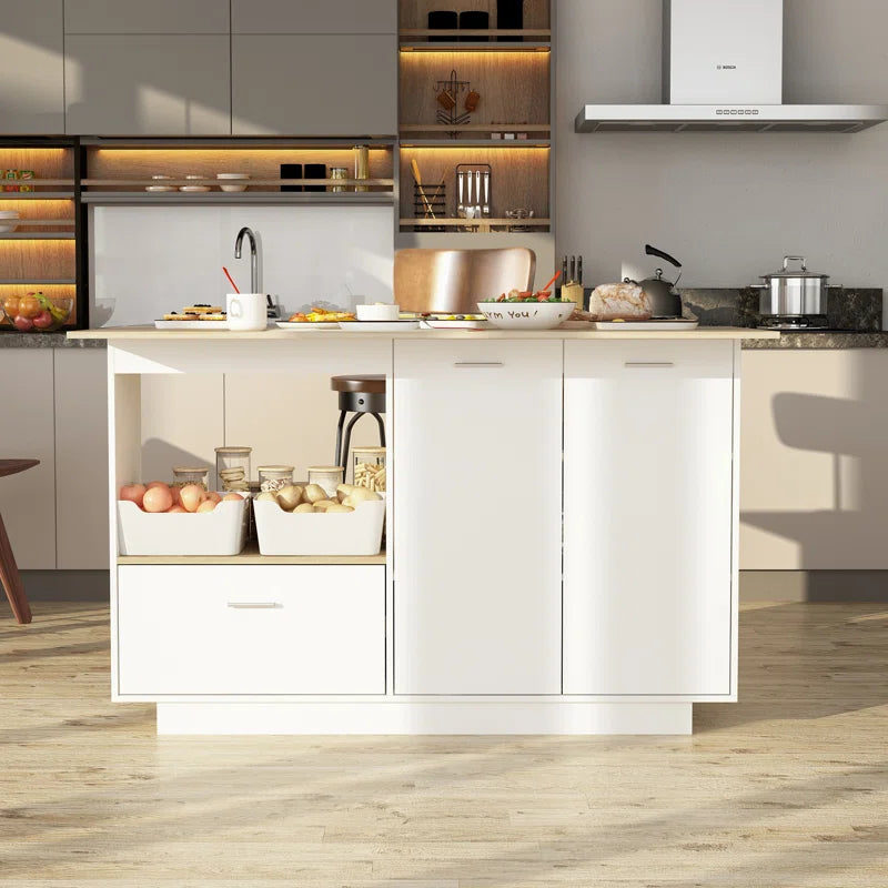 Kitchen Island Table: White Base Drop-Leaf Island with Storage & Light Wood Countertop