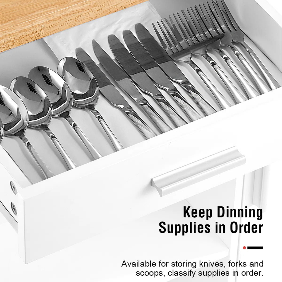 This kitchen island table is a perfect mix of utility and modern charm. Featuring a durable rubberwood countertop, a cabinet with adjustable shelves, a drawer, and 3 open racks, it provides ample storage for cookware and utensils. The lockable wheels ensure stability while the towel rack doubles as a push handle. Its compact size and elegant white finish make it an ideal addition to any modular kitchen.