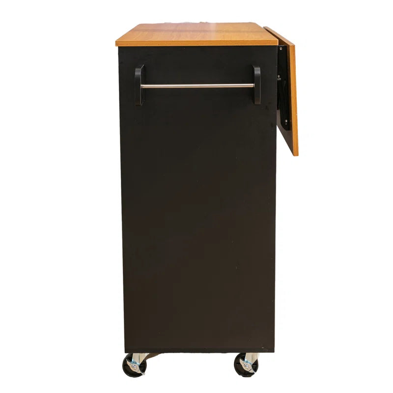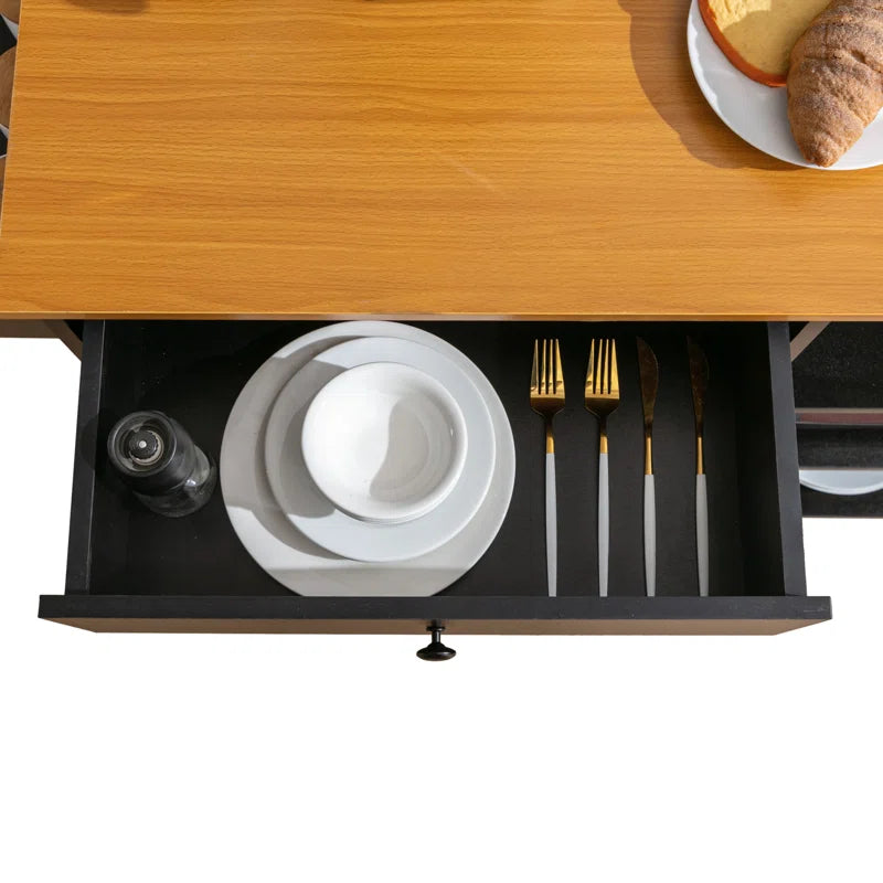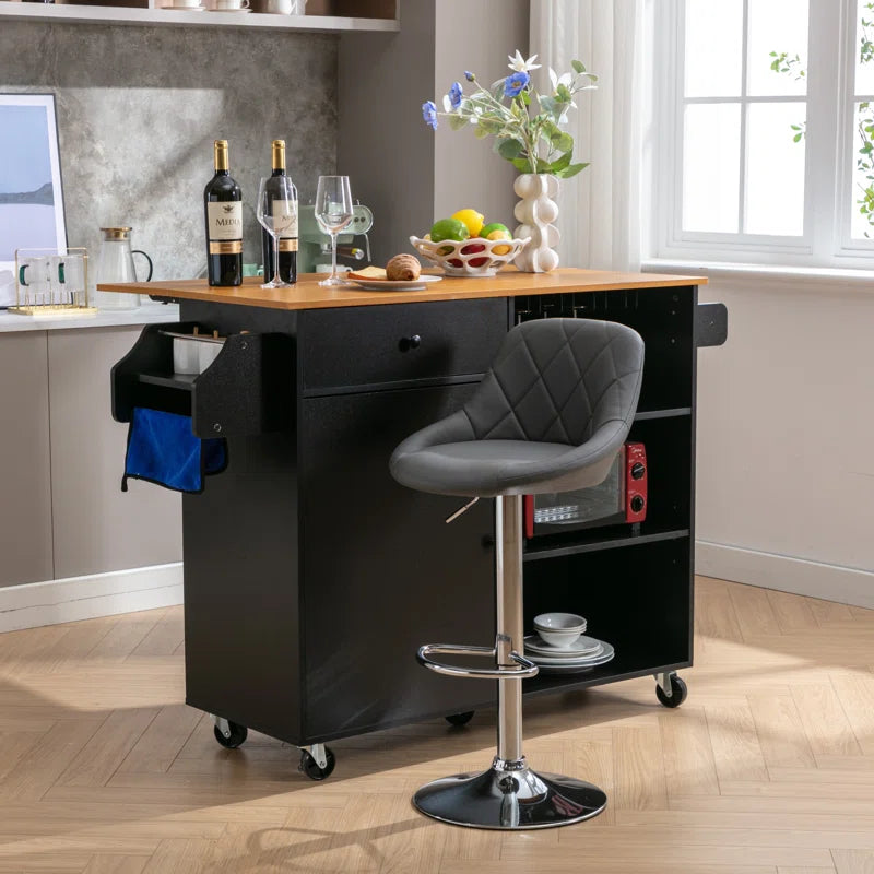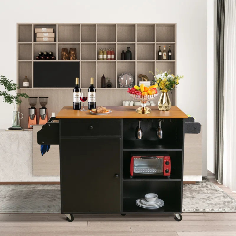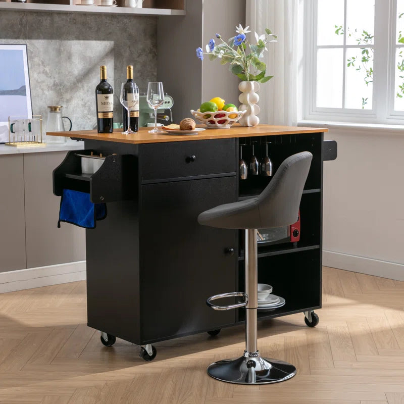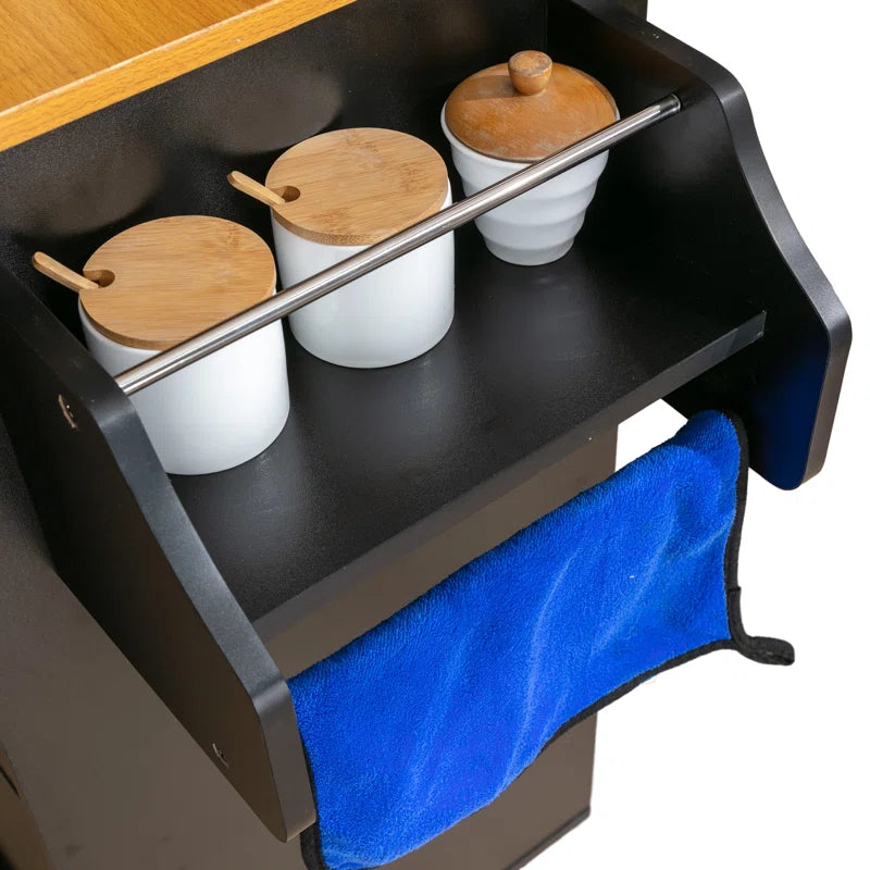 This kitchen island table on wheels is a perfect blend of style and practicality. With a spacious drop-leaf top, multiple drawers, interior shelves, and a cabinet, it offers generous storage for all your kitchen essentials. A built-in towel rack, spice rack, and smooth-locking wheels add convenience and mobility. Crafted from premium materials with a natural wood finish, this unit suits any modern or classic kitchen.