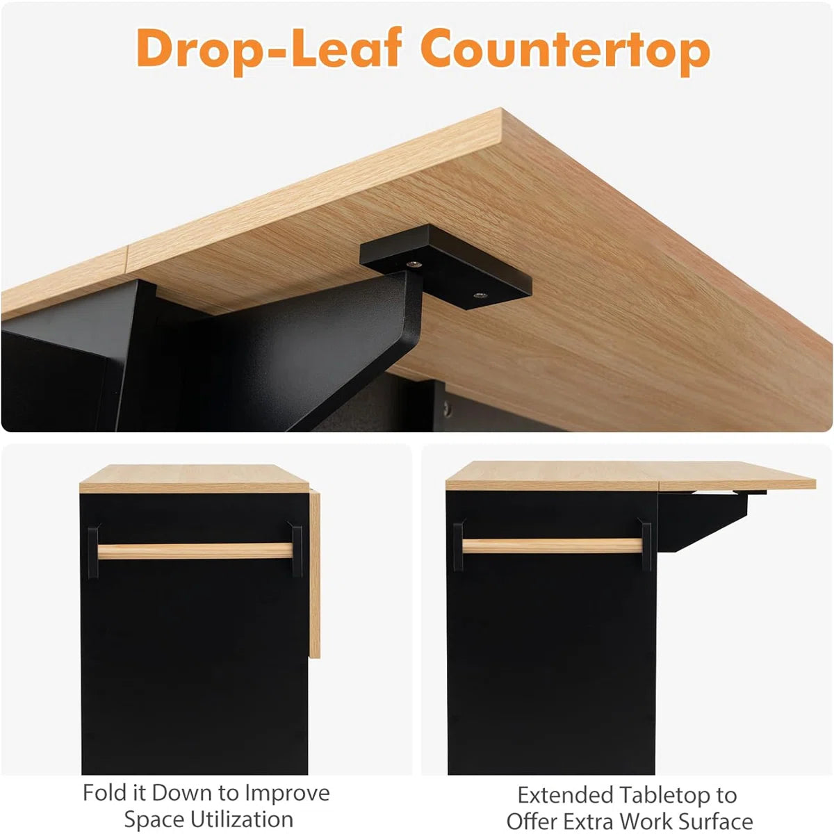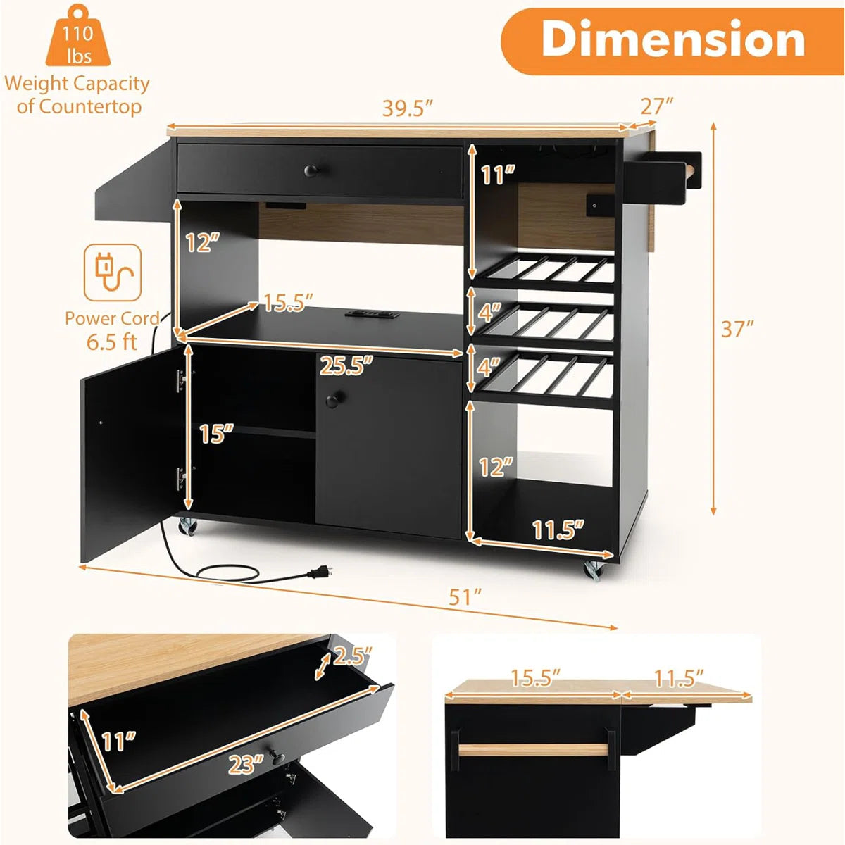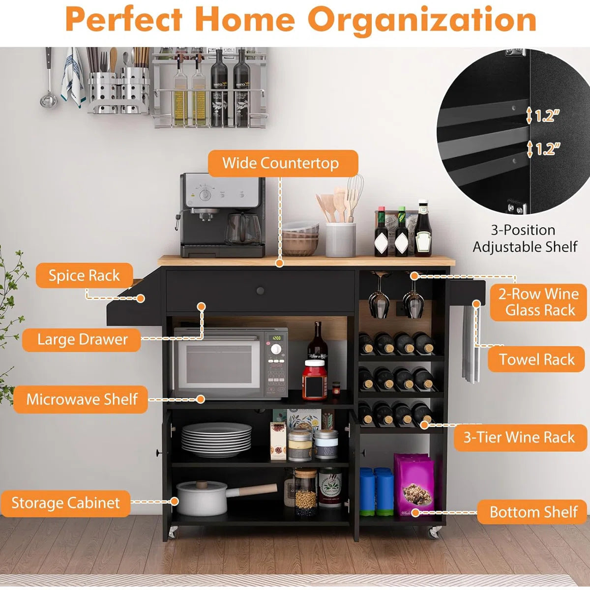 Upgrade your kitchen with this sleek black utility island cart, perfect for saving space and adding charm. With a drop-leaf countertop, wine bottle rack, stemware holder, microwave shelf, drawer, cabinet and spice rack, it handles everything from prep to serving. Built-in power outlets and USB ports make it ideal for plugging in appliances. Lockable wheels offer easy mobility, making it equally useful as a food cart or mini bar station.