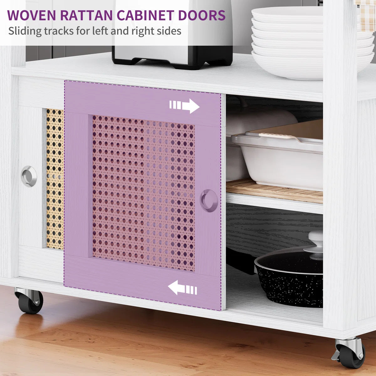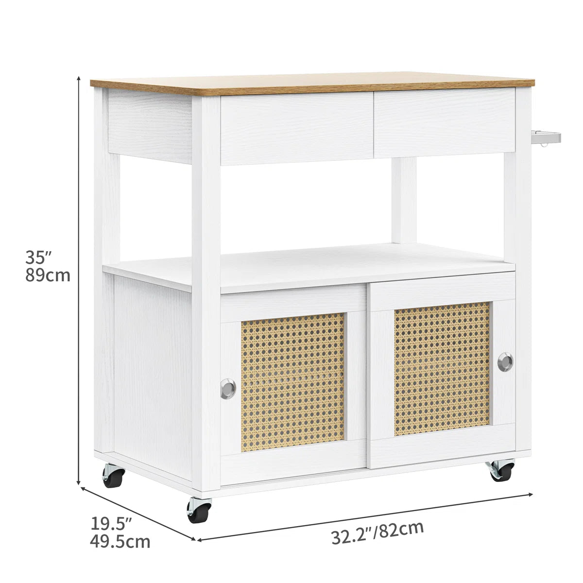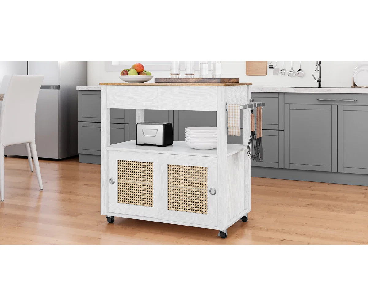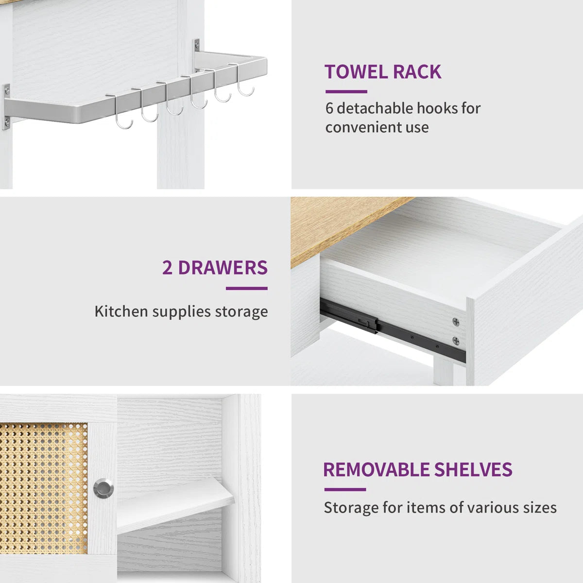 This rolling kitchen island cart is a perfect combination of style and utility. It features a smooth-sliding drawer, a double-door cabinet with natural rattan panels, and a handy spice rack, offering ample storage for all your kitchen essentials. The natural wood grain tabletop and classic white/black wood design enhance any kitchen decor. Four 360° lockable wheels provide easy and safe mobility, making it ideal for keeping your kitchen organised and accessible.