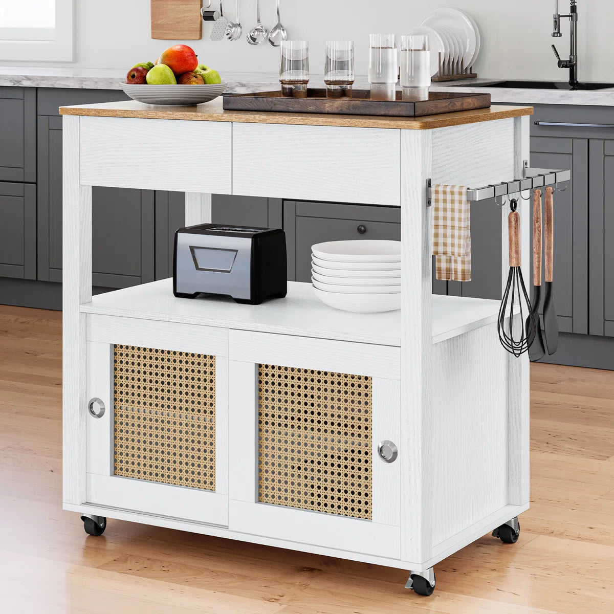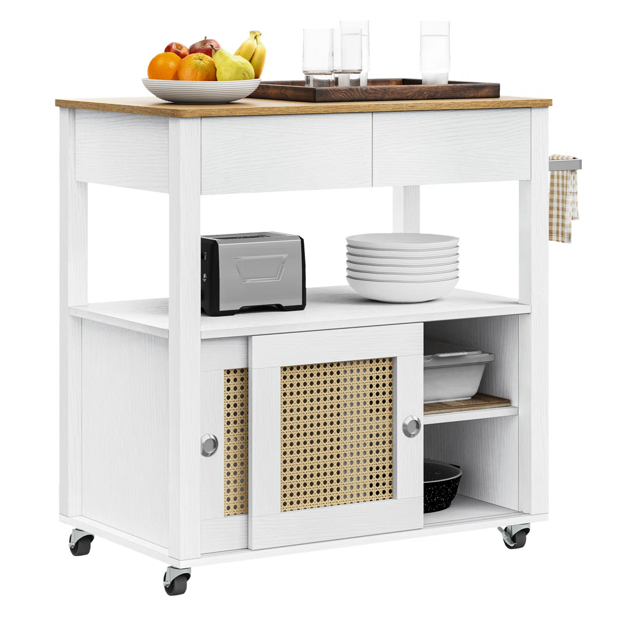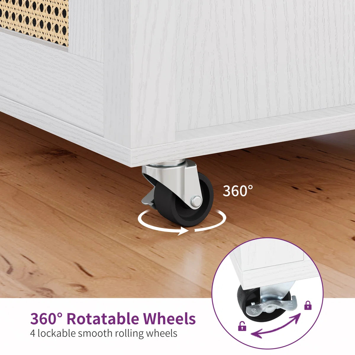 This rolling kitchen island cart is a perfect combination of style and utility. It features a smooth-sliding drawer, a double-door cabinet with natural rattan panels, and a handy spice rack, offering ample storage for all your kitchen essentials. The natural wood grain tabletop and classic white/black wood design enhance any kitchen decor. Four 360° lockable wheels provide easy and safe mobility, making it ideal for keeping your kitchen organised and accessible.