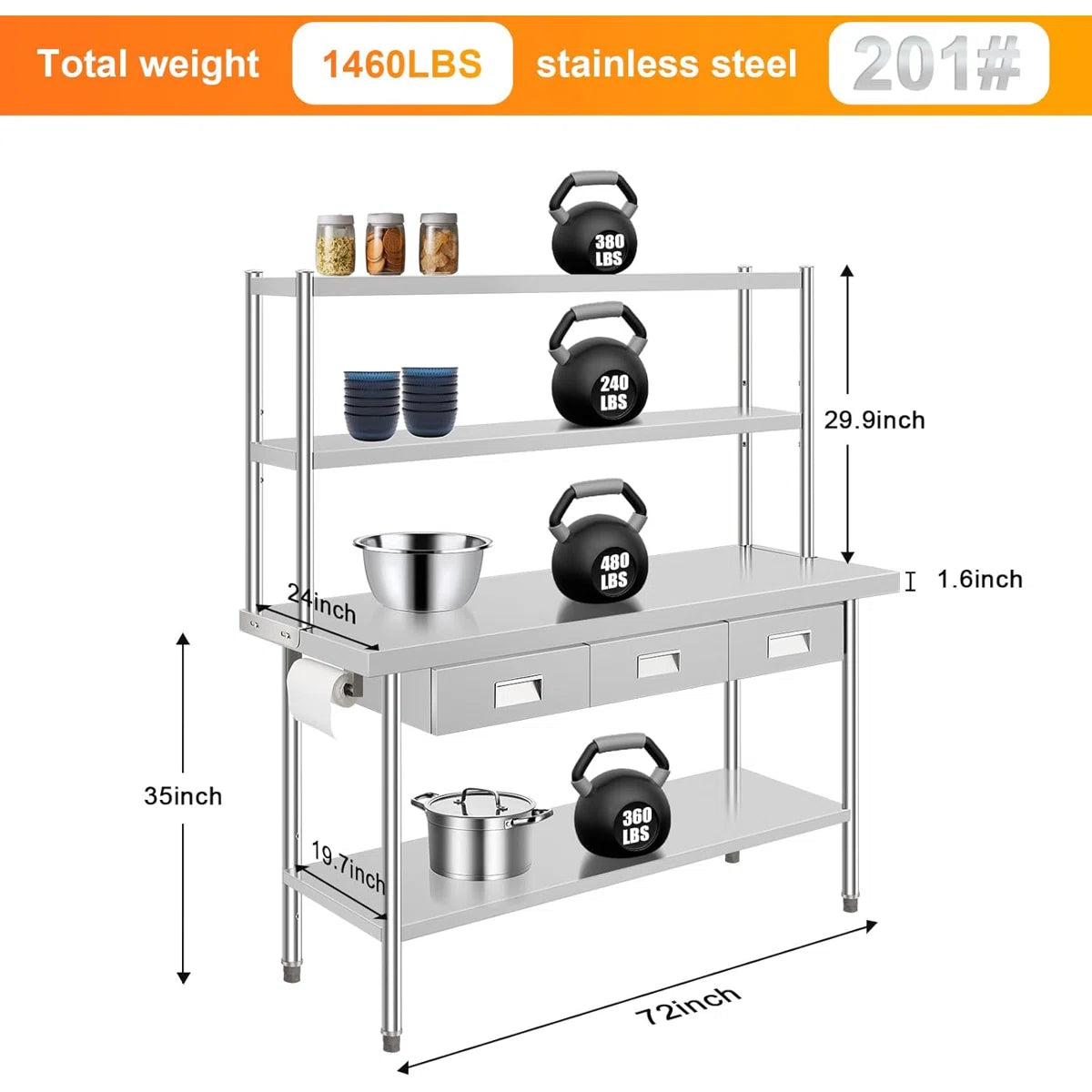 Kitchen Rack: 24'' Stainless Steel Table With Over Shelves and 3 Drawers
