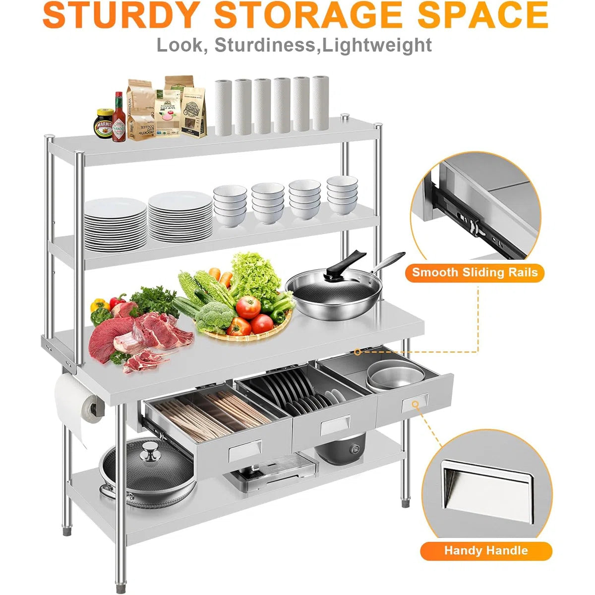 Kitchen Rack: 24'' Stainless Steel Table With Over Shelves and 3 Drawers Features Durable Stainless Steel: This table is ideal for home kitchens, restaurants, garages, and warehouses since... Read more