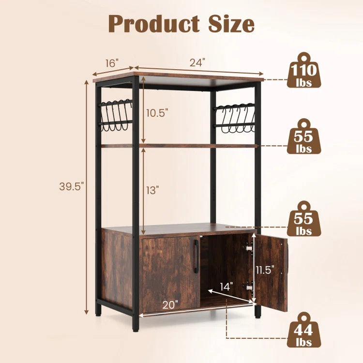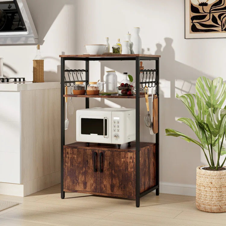 This multipurpose baker's rack will add flair to your kitchen or dining space. A cupboard to store pots, pans, or dishes is placed next to the open shelves, which offer easy access and display space for kitchen necessities. Ten S-shaped hooks are ideal for securing towels, oven mitts, and other items like knives. Sturdiness and long-term use are guaranteed by the robust metal frame. In the meantime, the floor cabinet's anti-toppling mechanism makes it sturdy enough to support your everyday belongings without swaying. Overall, this industrial storage rack is a clever way to maximize living space for anyone.