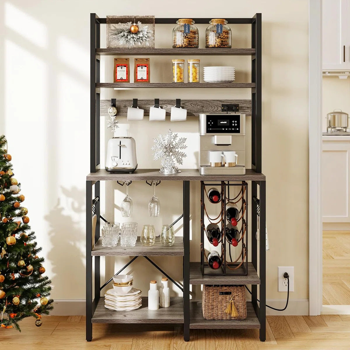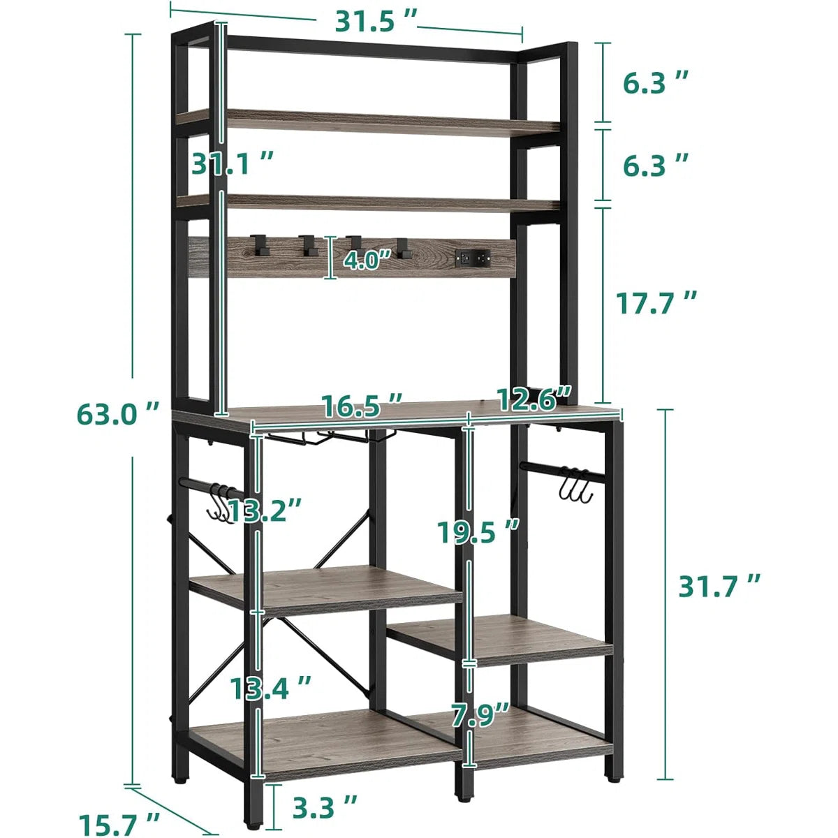 - Farmhouse Style: With its black frame and oak gray timber grain, this baker rack oozes country charm and adds flair to any interior design. It is versatile and may be used as a standalone coffee bar, pantry shelves, kitchen organizer, or display unit for the dining room.