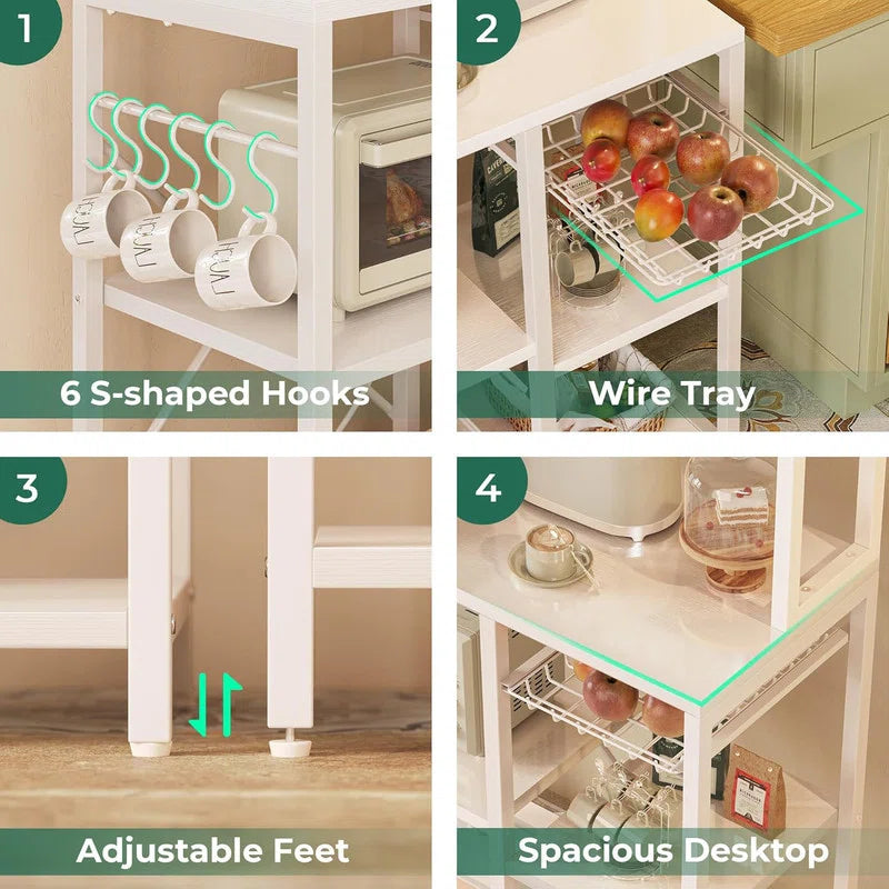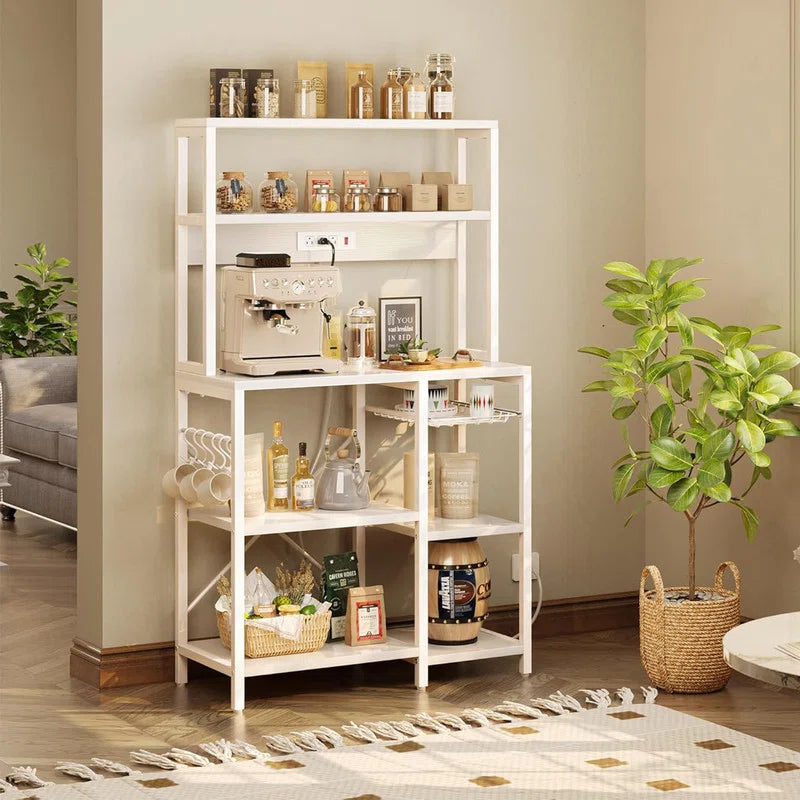 Solid and Stable Construction: Your dinnerware and kitchen appliances will have a dependable place on this sturdy kitchen organizer shelf, which is made of solid particle board and has a sturdy metal frame. Additionally, this baker's rack remains even more stabler on the floor thanks to the anti-tip mechanism and balanced adjustable feet.