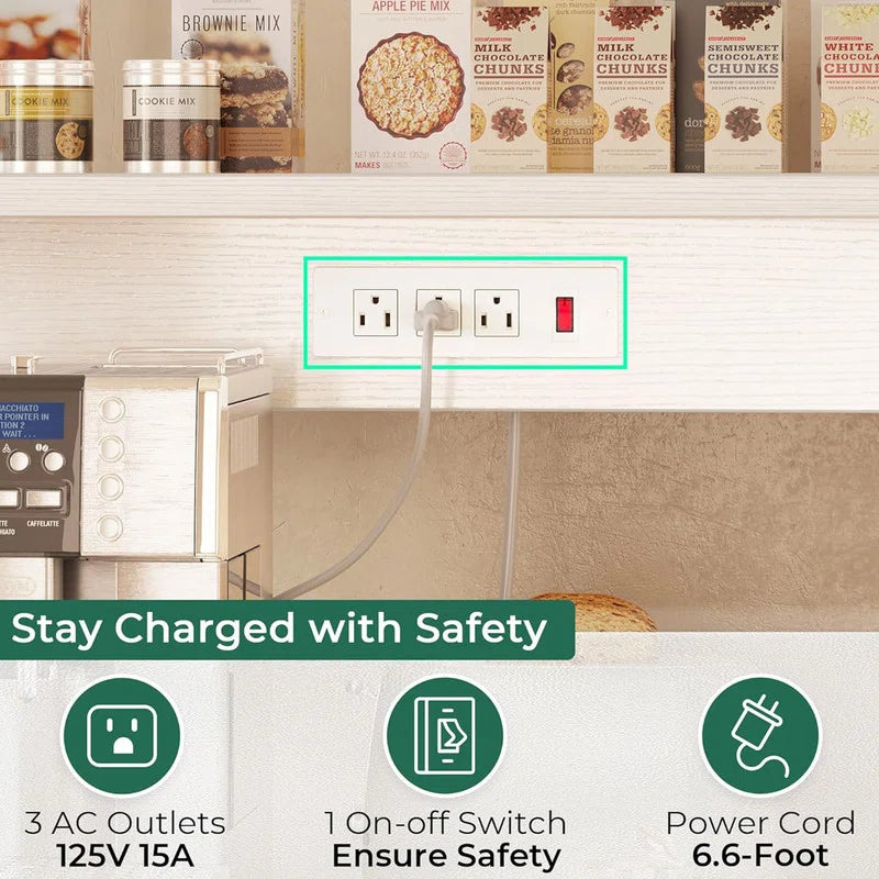 - 3 AC Outlets and 1 On-Off Switch: The power strip integrated into the kitchen shelf rack will quickly delight coffee or baking fans! More charging ports, easy access to plug-in your kitchen supplies, and increased security by turning off the switch while not in use. All for a clean and secure kitchen.