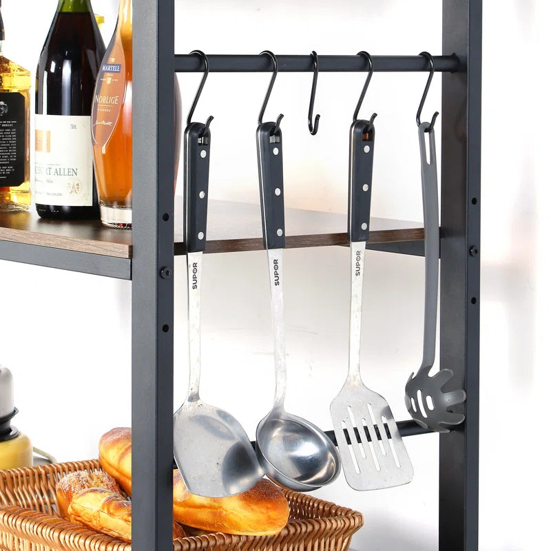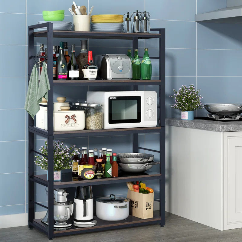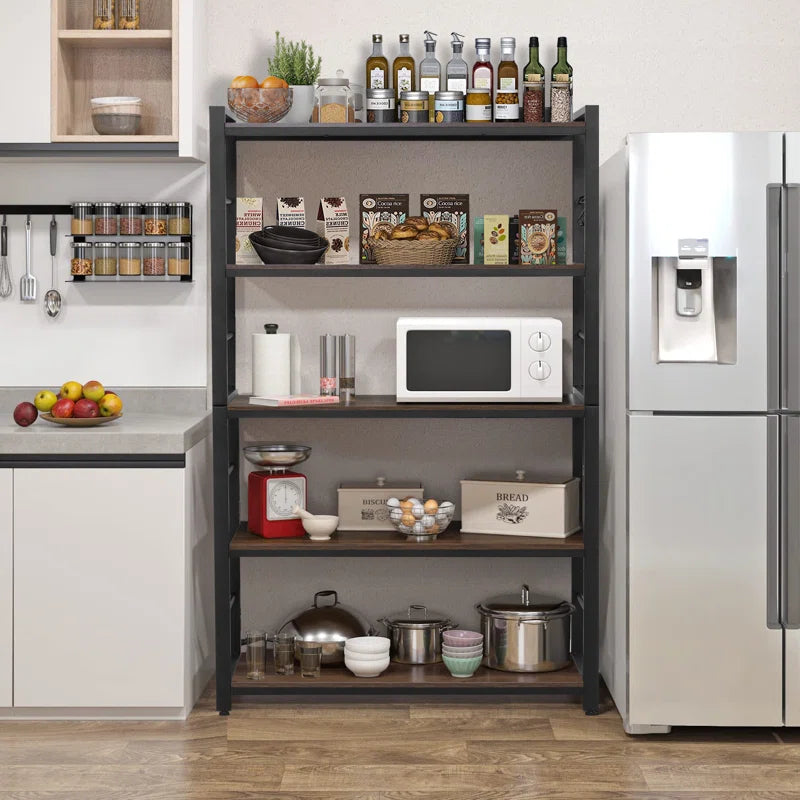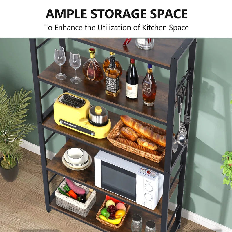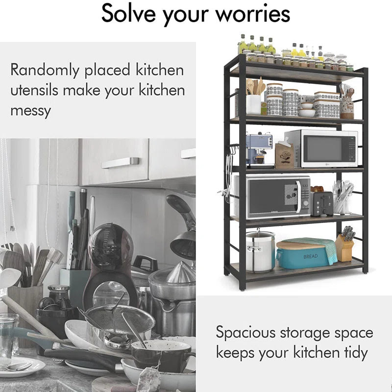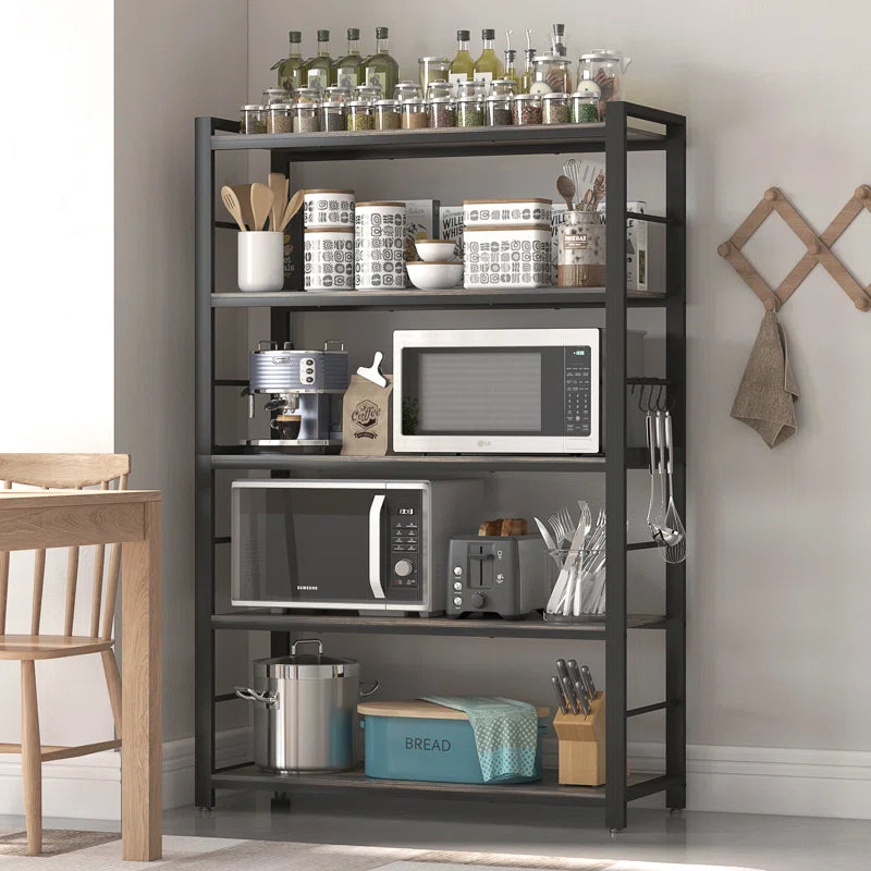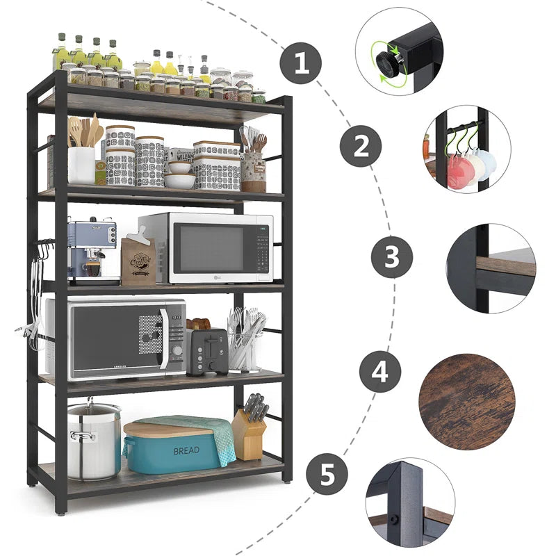 High-quality MDF and a steel frame make up the baker's rack. There is plenty of storage space. Your microwaves, toasters, pans, and other cooking tools are available on 5 levels of open shelves. You may install each shelf at 3 different heights, which you can modify based on the size of the cookware you choose to use. Because of its simple design, it complements your decor flawlessly. This freestanding shelf is not just a practical kitchen shelf but also ideal for garages, craft rooms, apartments, dorm rooms, and other spaces that need a stylish yet robust storage solution.