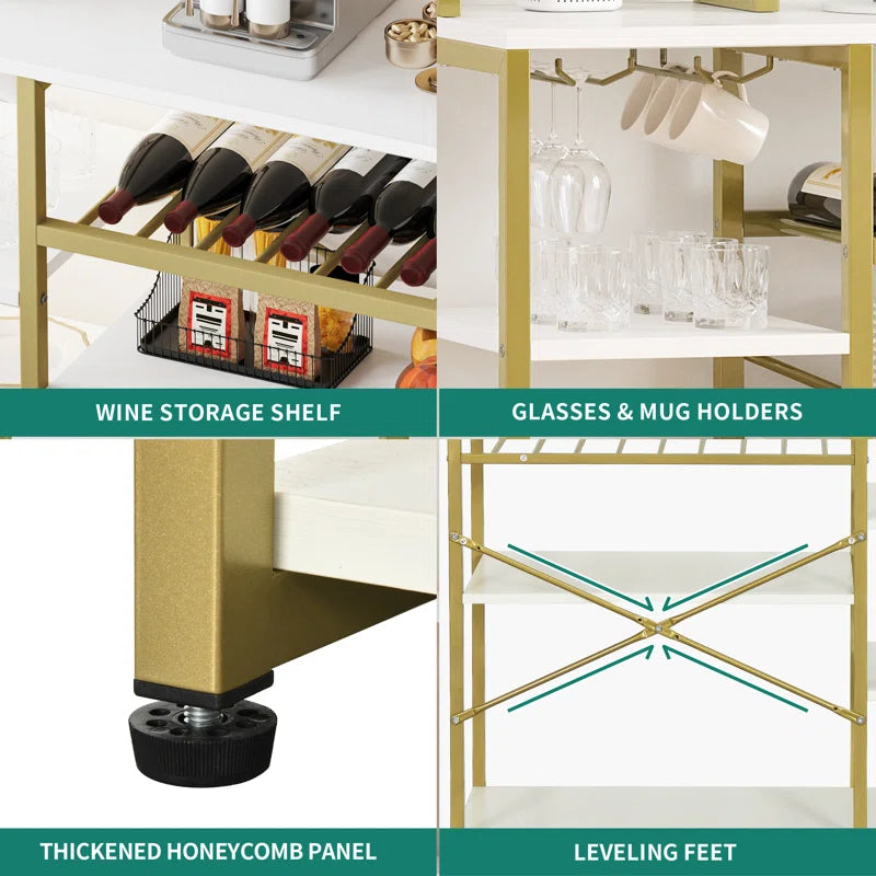 - Ample Storage Space: Take advantage of the thoughtfully built three-tier wine rack that can hold up to 21 bottles and the three-tier open shelves that may be used to store pots, pans, microwaves, utensils, spices, and other items. With its many storage options, this rack keeps your kitchen necessities close at hand and well-organized.