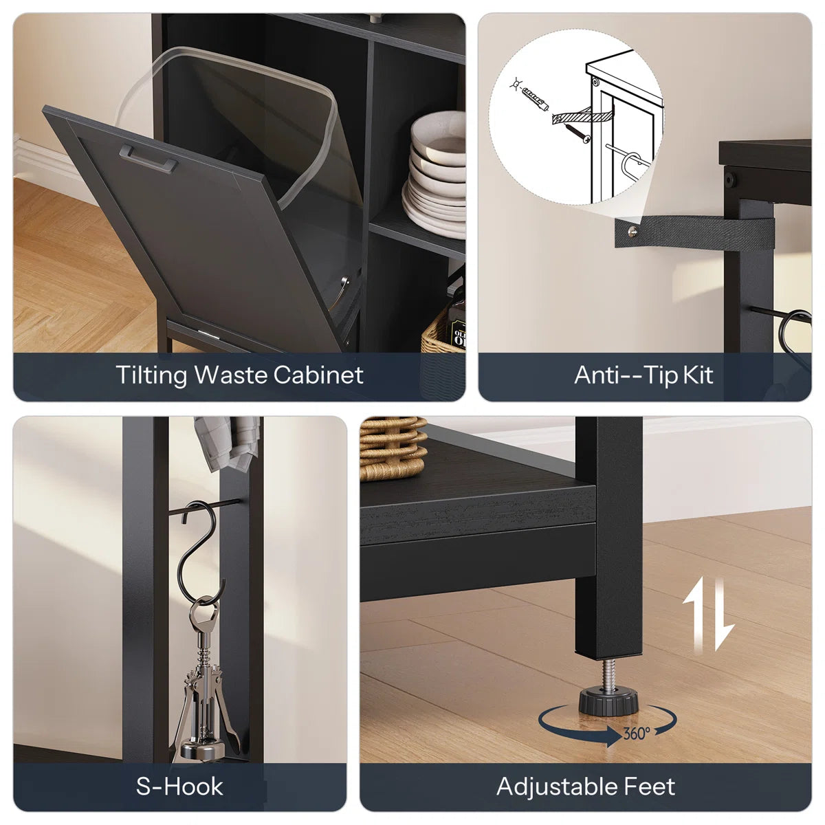 - Tilted Trash Can Cabinet: To ensure an ordered kitchen, this kitchen microwave stand cleverly integrates a slanted trash can cabinet that can accommodate a 50-gallon trash can. This allows for rapid and effective garbage disposal.