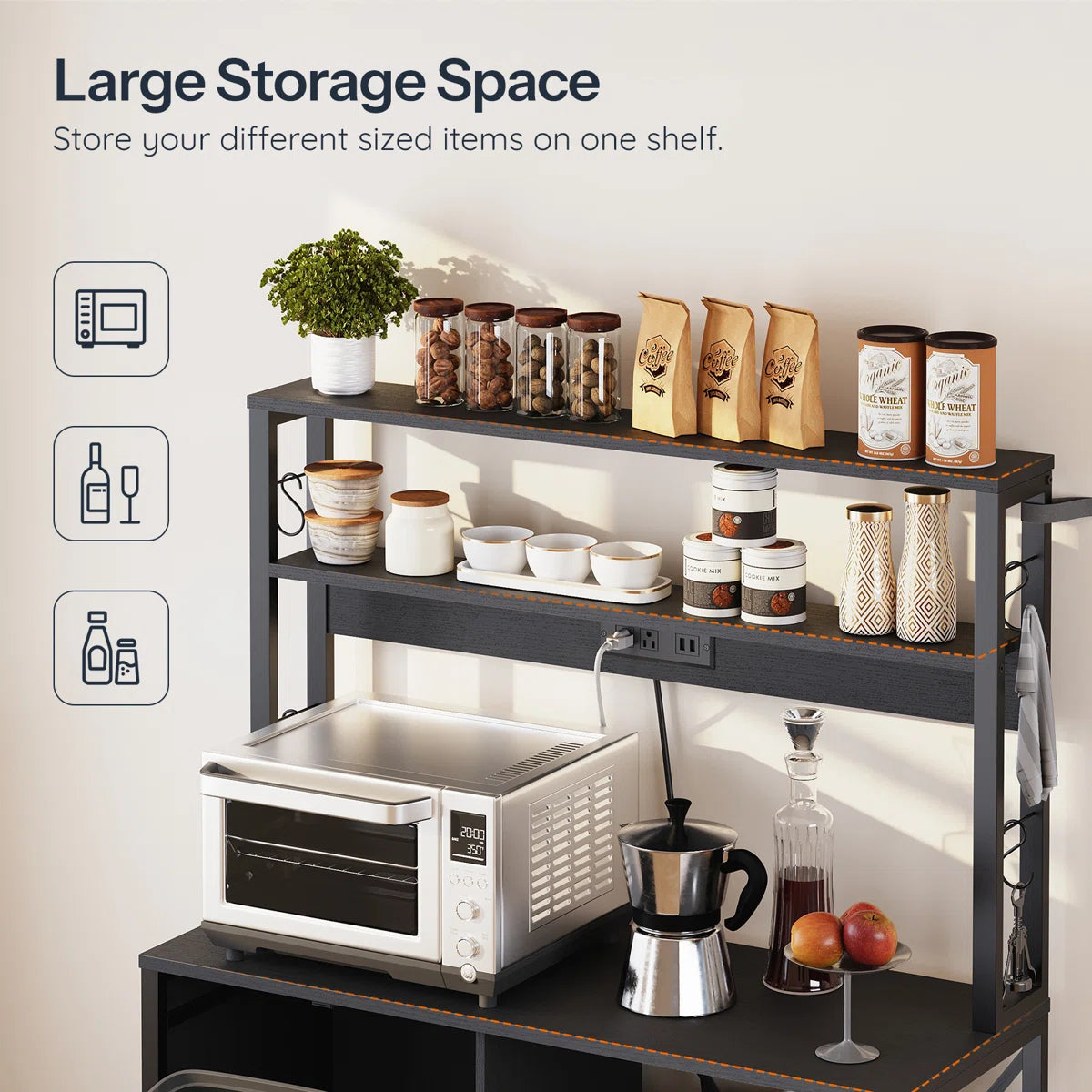 - Convenient Power Outlet: The bread rack has 2 USB connections and 2 AC outlets, so you can charge your phone or use numerous kitchen equipment at once. This helps you say goodbye to tangled wires and enjoy a clean kitchen.