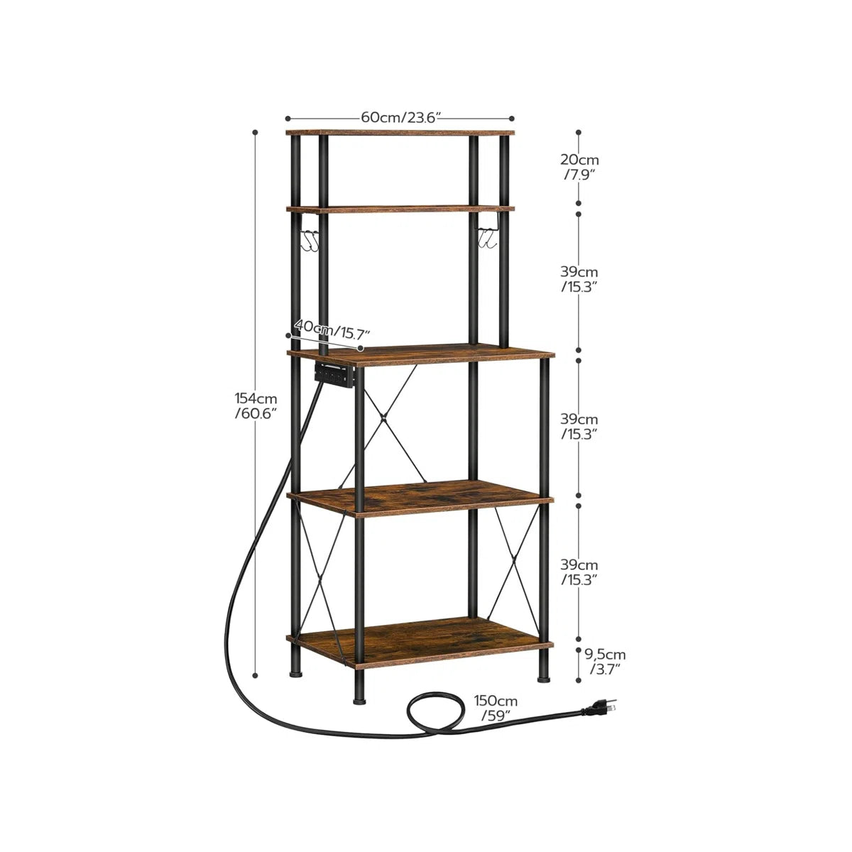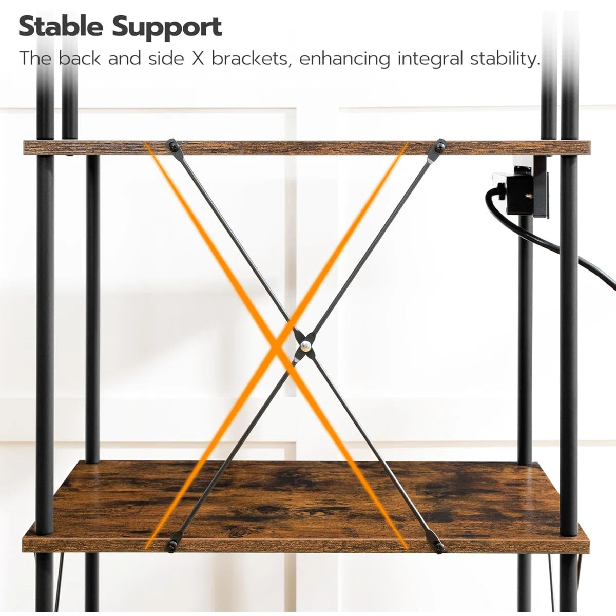 This baker's rack shelf's power issue is resolved by its four outlets. Cooking soup and bread while baking bread and extracting juice while brewing coffee is a simple idea. This coffee bar has 5 shelves, 3 of which are large enough to hold bread machines and 2 of which are small enough to hold spice bottles like nut jars. 4 S-shaped hooks are perfect for knives, forks, towels, mugs, and spatulas. The microwave stand has X-shaped iron braces to improve intrinsic stability and high-quality pipes to guarantee strength and balance. The display rack can stand steadily thanks to its adjustable feet and the included anti-tip kit.