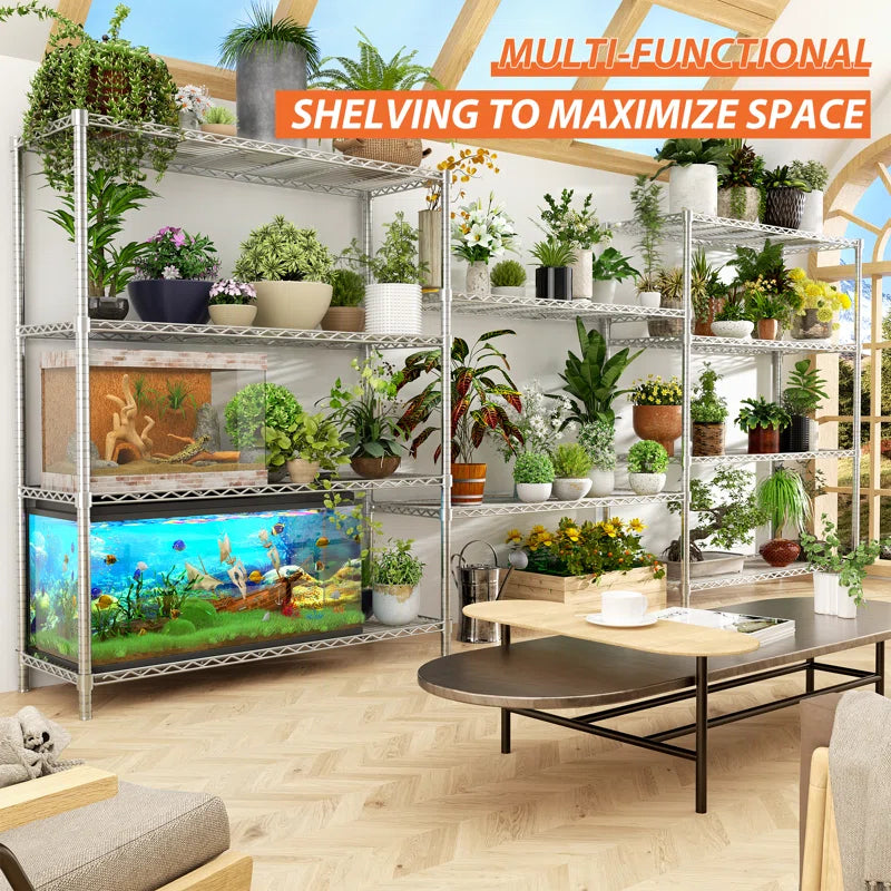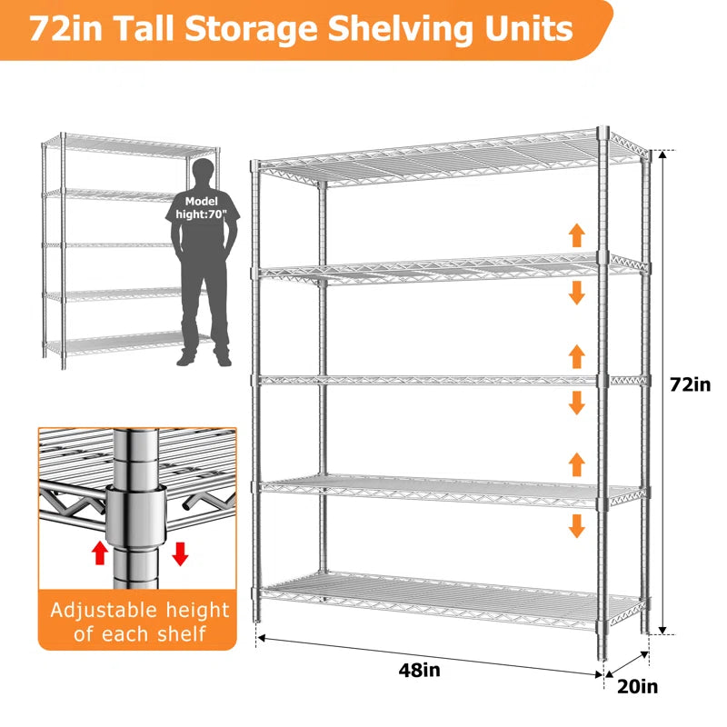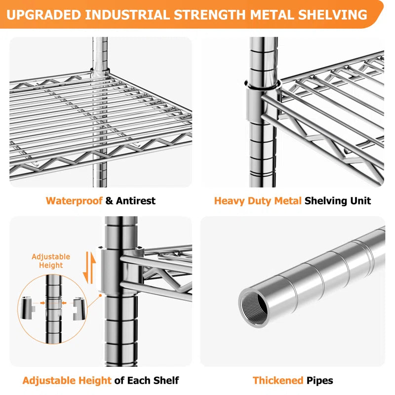 This ultra-durable steel wire shelving unit will improve your storage. It is simple to assemble and requires no equipment, making it ideal for professional use. You can tailor the unit to meet your unique storage needs thanks to the adjustable shelf height, and anti-tipping features provide stability and safety, even for heavy items. The rust-resistant, easily-cleanable wire shelves offer dependable storage for many years to come, and our all-metal structure ensures durability. These shelves have a high weight capacity since they are made of sturdy materials and robust steel wire. Make the most of your available space and organize with confidence!