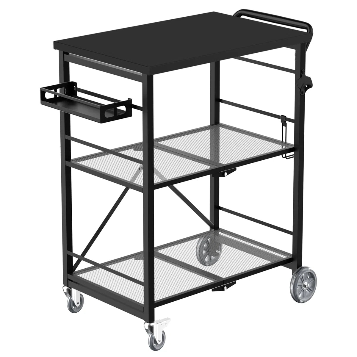 A three-shelf foldable kitchen island cart, a table with two lockable wheels, a folding grill cart, and a metal pizza oven stand. An outdoor moving cart made of stainless steel. This mobile eating cart is suitable for both indoor and outdoor use. It can be used as a kitchen, service area, or workshop for outdoor cooking. It can also be used to set up a portable oven or grill. It is perfect for camping, bars, and parties at home.