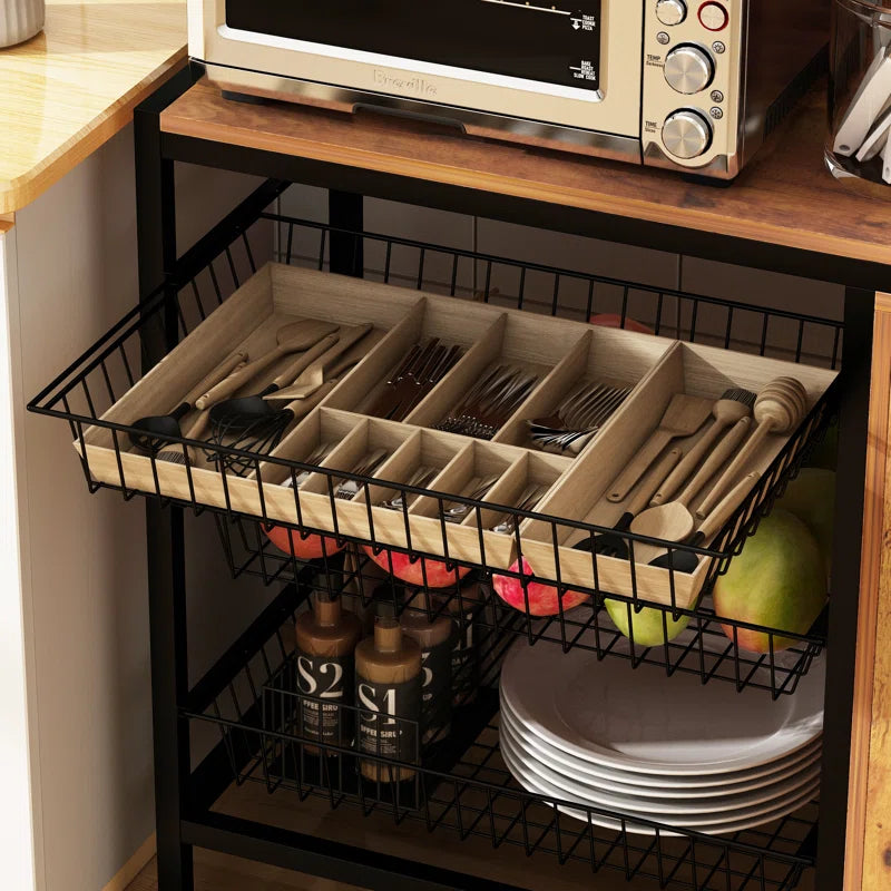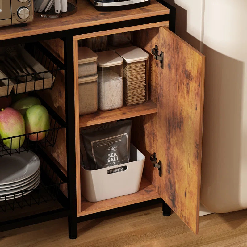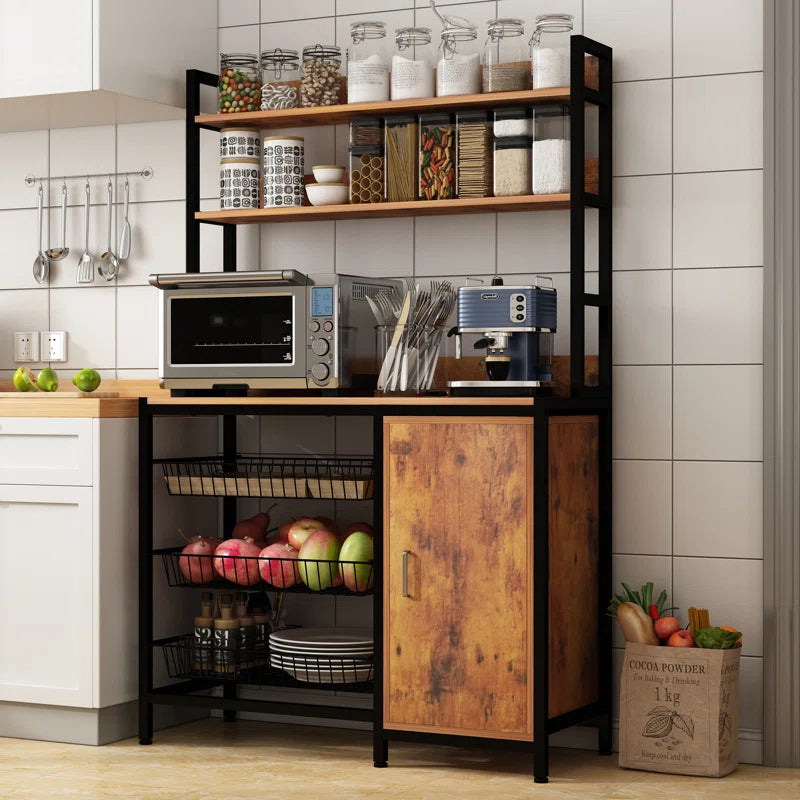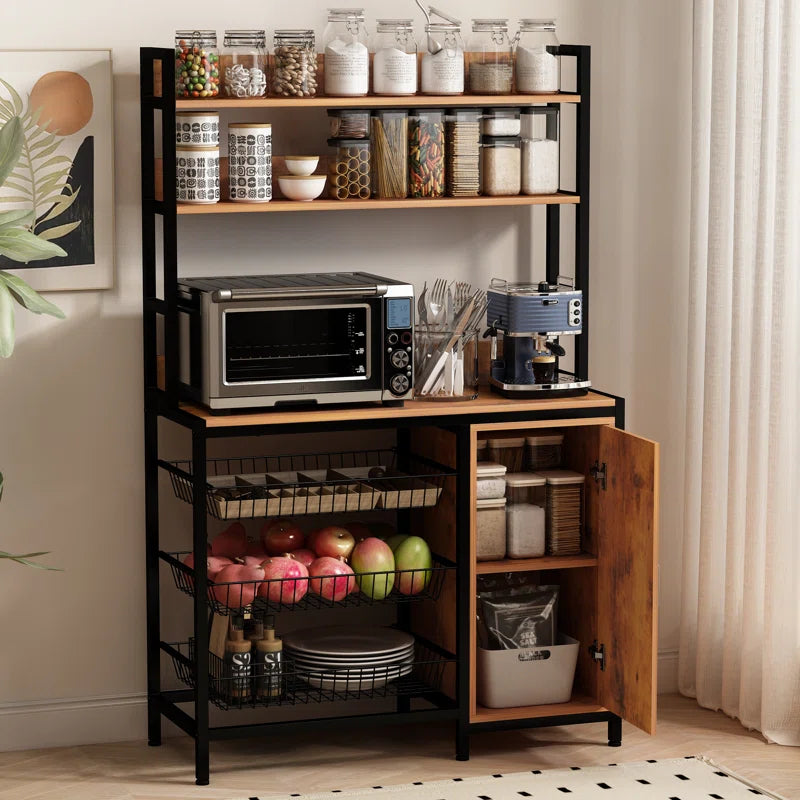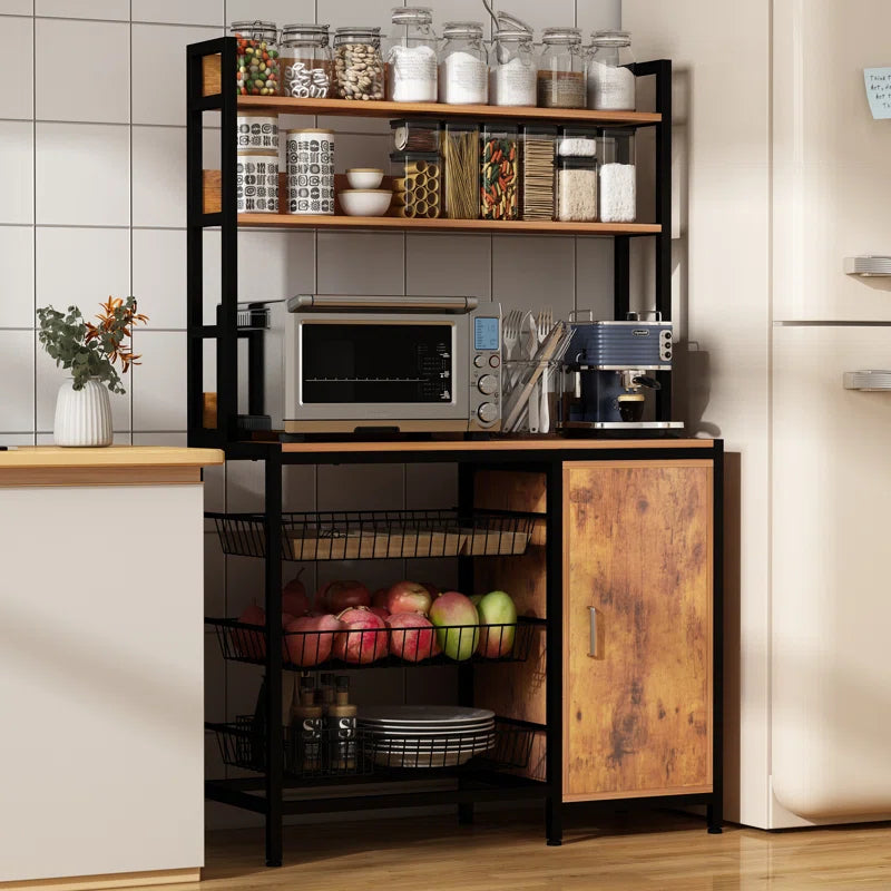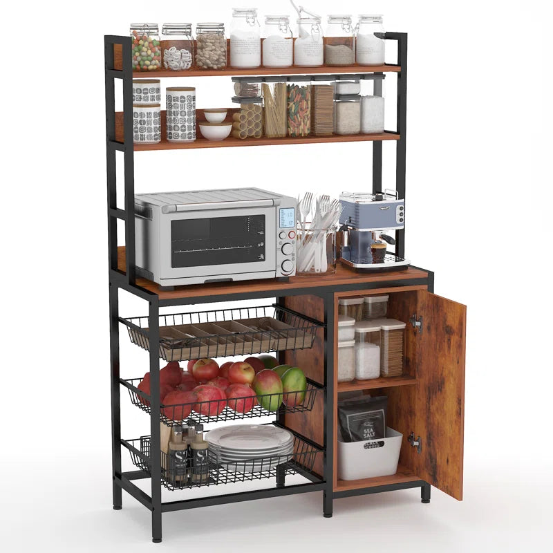 Enjoy a long-lasting kitchen baker's rack composed of sturdy steel and premium MDF. With the 3 spacious pull-out metal baskets that this storage rack has to offer, you may arrange your spices and dishes according to your own storage preferences. These mesh baskets with good ventilation are perfect for preserving the freshness of your produce. There are two shelves within the cabinet, and the doors have magnets to keep them shut. This baker's rack is intended to assist in keeping a clean and organized kitchen with its variety of storage options.