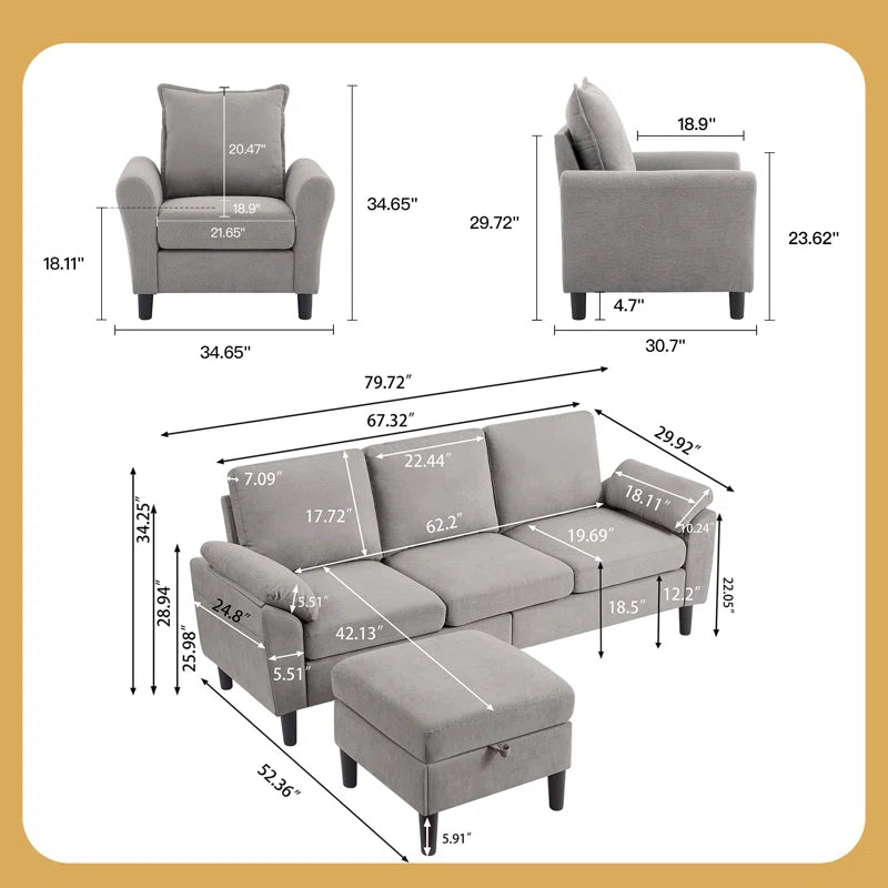 Give your living space a stylish upgrade with this luxury 3-piece sectional sofa set. Complete with a sofa, chair, and ottoman, it blends comfort with functionality. Soft upholstery, pocket spring seating, and foam cushioning offer a cozy lounge experience. With side storage pockets, washable cushion covers, and a reversible ottoman, it’s perfect for compact modern homes. Built on a sturdy wood frame with easy assembly, it’s a reliable and elegant addition.