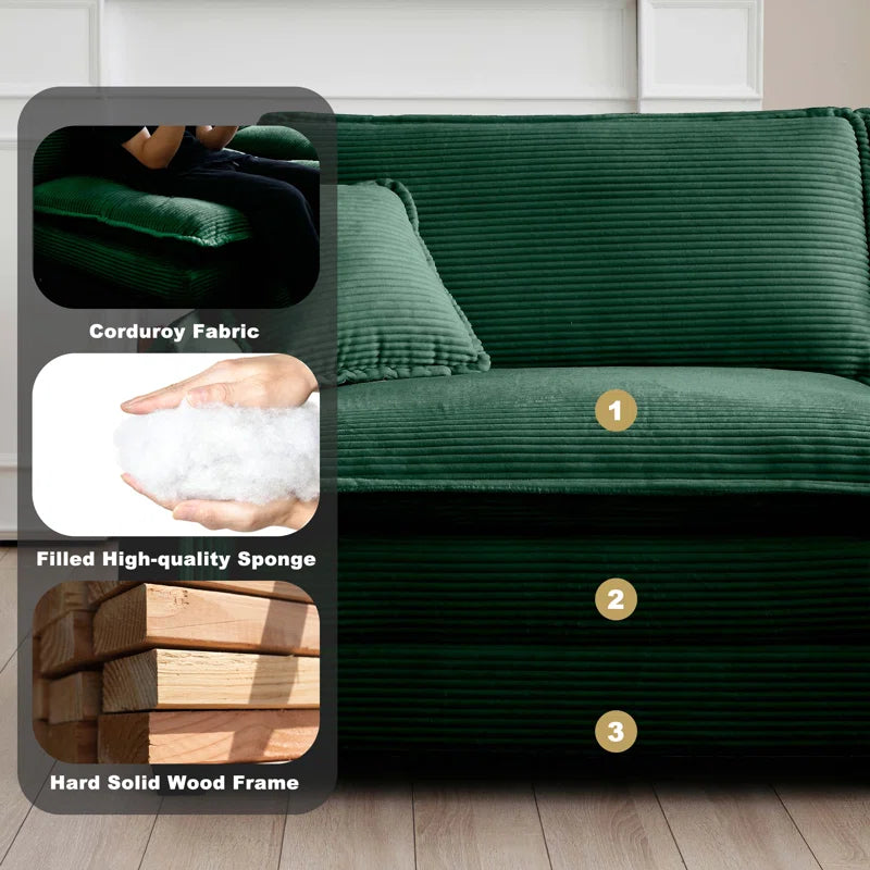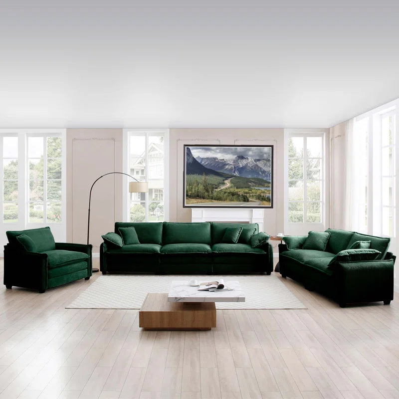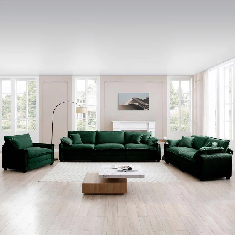 Bring home timeless charm and cloud-like comfort with this 3-piece oversized sectional sofa set, featuring a single-seater chair, a 2-seater loveseat, and a spacious 3-seater sofa. Wrapped in plush corduroy fabric, this set offers a retro-modern look and superior cosiness with memory foam cushions and soft throw pillows. Perfect for any room setup with four beautiful colour options, it’s the ultimate blend of style, comfort, and flexibility.
