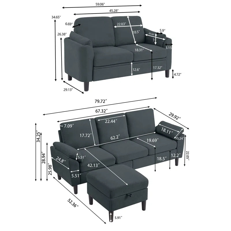 Introducing our stunning 3-piece sectional sofa set, perfect for any modern living room. This set includes a spacious sofa, a cozy loveseat, and a stylish ottoman, all designed to provide maximum comfort and relaxation. The luxurious sofa features plush cushions and soft polyester blend upholstery, making it ideal for lounging or entertaining guests. The matching chair and ottoman complete the set, adding extra seating and flair to your space. With side storage pockets and a reversible ottoman, it blends style with practicality. Create a cozy and inviting atmosphere for you and your loved ones with this elegant upgrade.