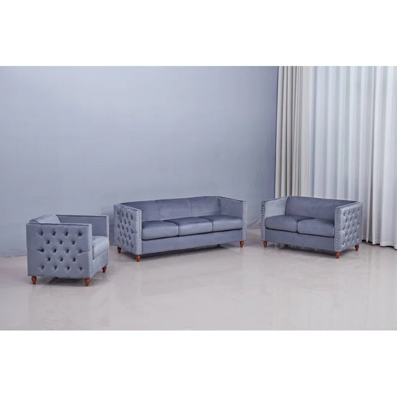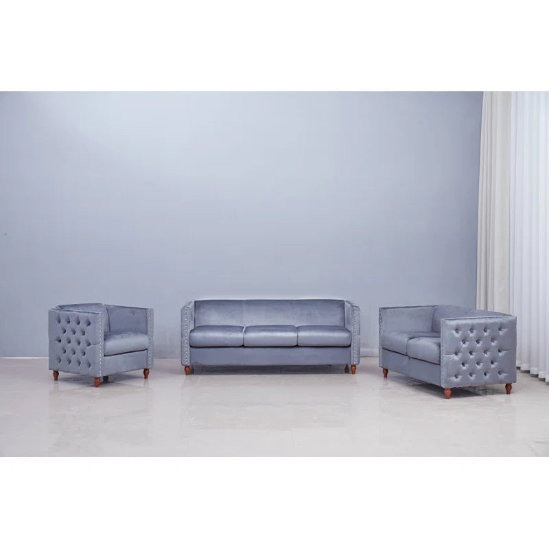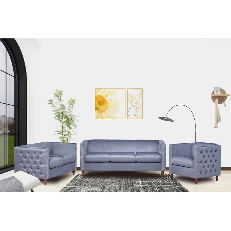 Luxury Sofa Sets: 3-Piece Velvet Chesterfield Sofa Set with Tufted Design and Rolled Arms
