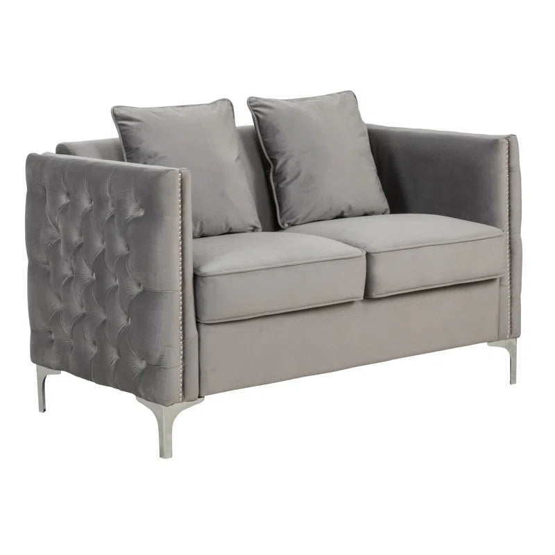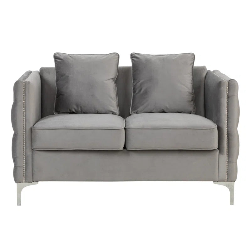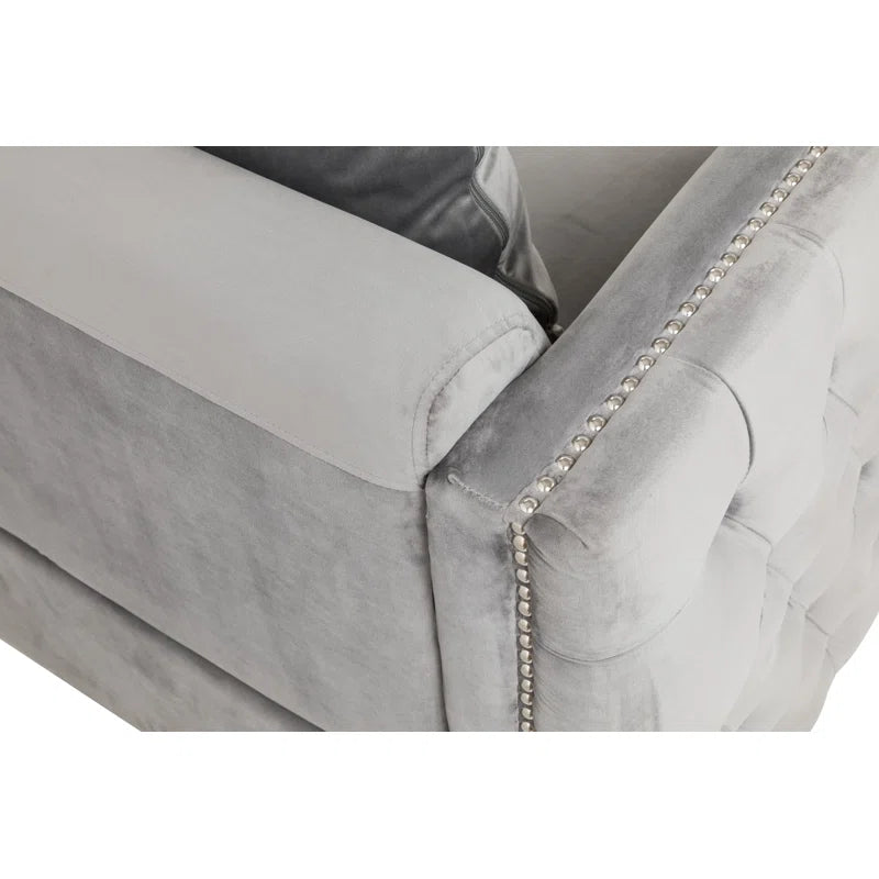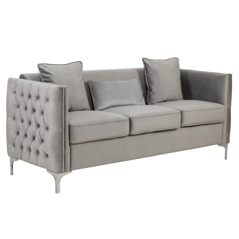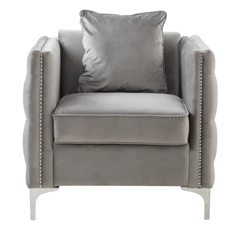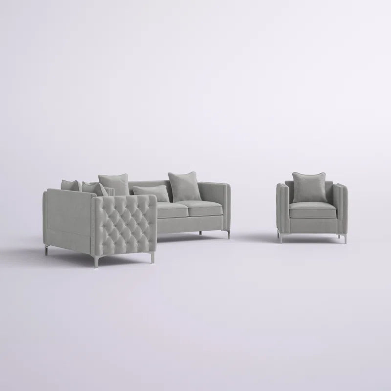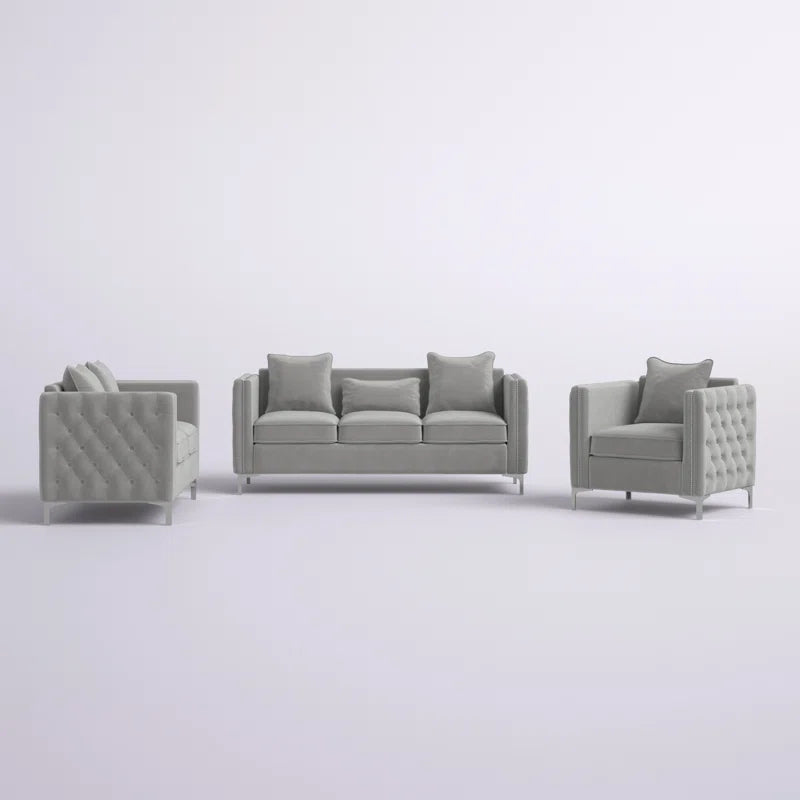 Transform your living room with this elegant 3-piece luxury sofa set designed in a sleek mid-century modern style. This complete set includes a sofa, loveseat, and armchair, each featuring a solid wood frame and supported by shiny chrome-finished metal legs. Upholstered in rich velvet, the set is enhanced with button tufting and nailhead trim for a touch of glam. Toss pillows are included to complete the look effortlessly. Just pair with a coffee table and area rug to achieve a stylish, catalogue-ready space.