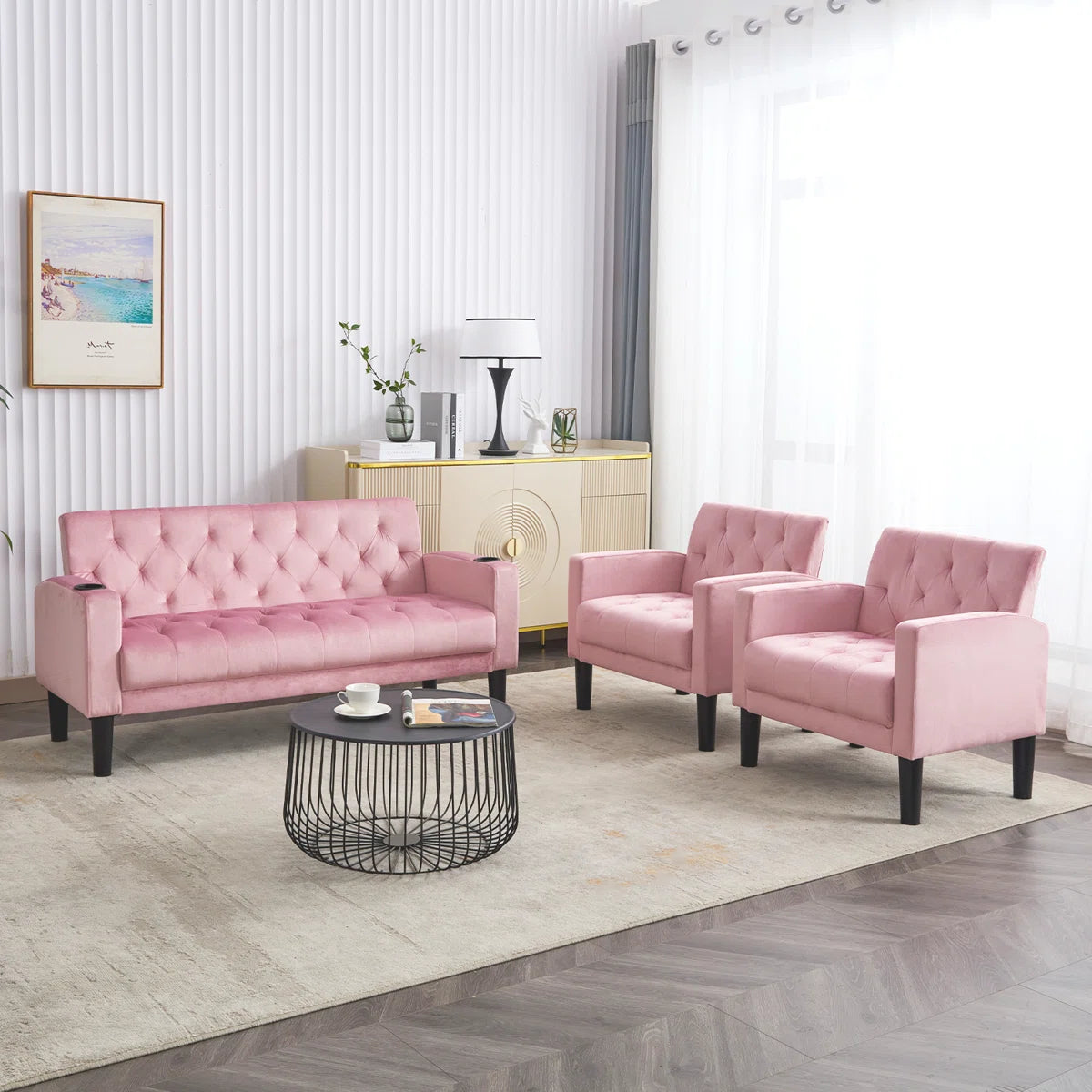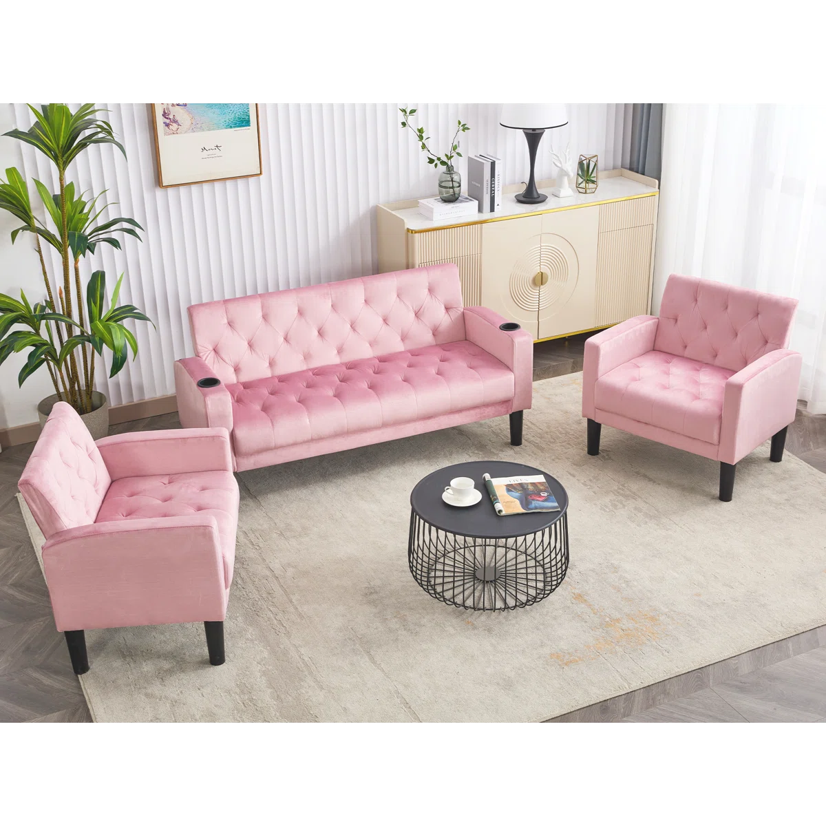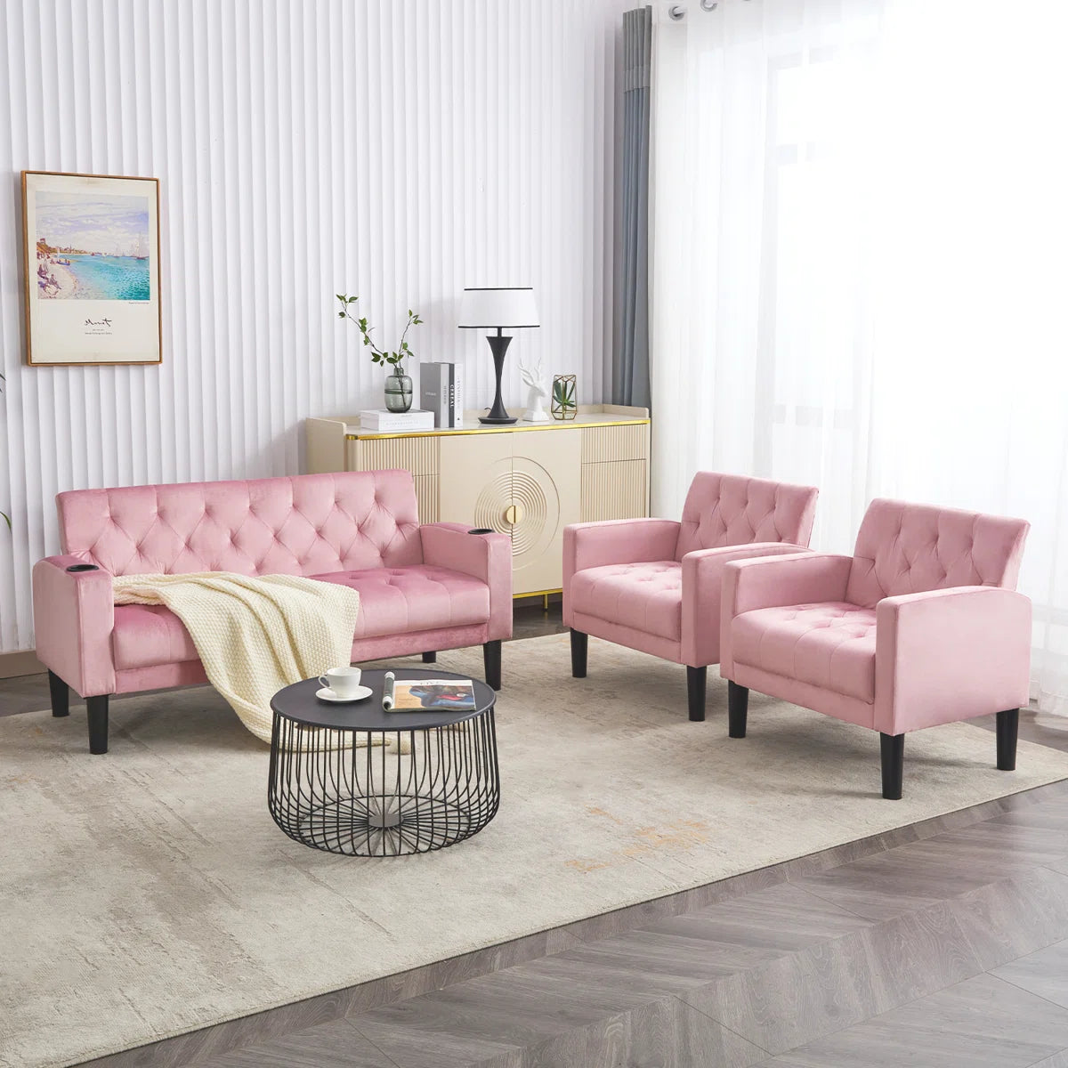 Luxury Sofa Sets: 3-Piece Velvet Sofa Set – Loveseat & 2 Chairs with Tufted Design, & Cup Holders
