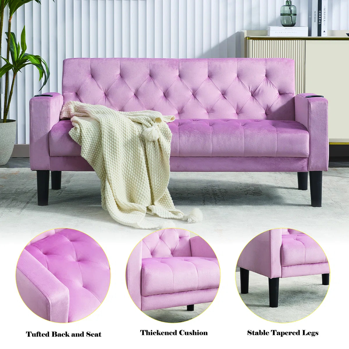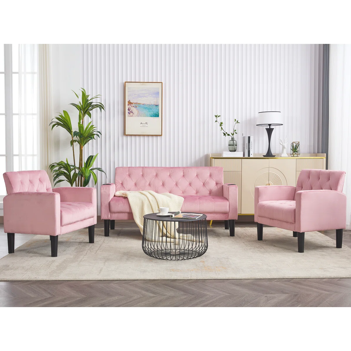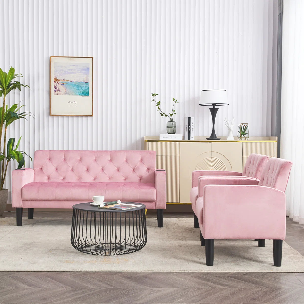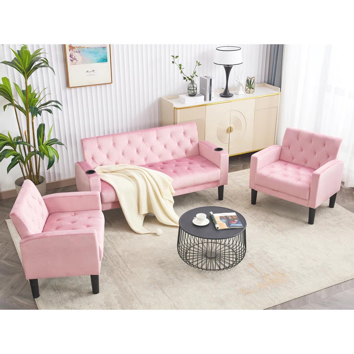 Luxury Sofa Sets: 3-Piece Velvet Sofa Set – Loveseat & 2 Chairs with Tufted Design, & Cup Holders