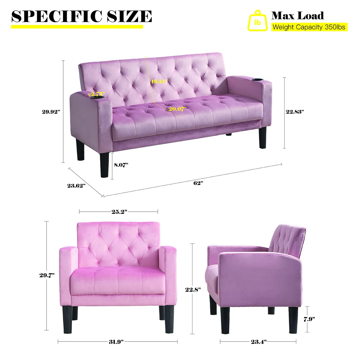 • Sofa: 29.92'' H x 62'' W x 23.62'' D
