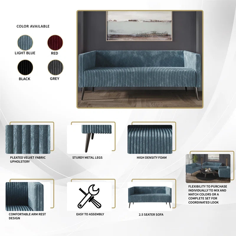Redefine your living space with this modern 3-piece velvet sofa set, crafted with elegant vertical tufting and luxurious 100% velvet polyester upholstery. Supported by sturdy metal legs, this set features a spacious sofa, loveseat, and chair, providing optimal comfort. Available in bold colours like red, blue, black, and grey, it’s perfect for those seeking style and cosiness in one beautifully crafted set.