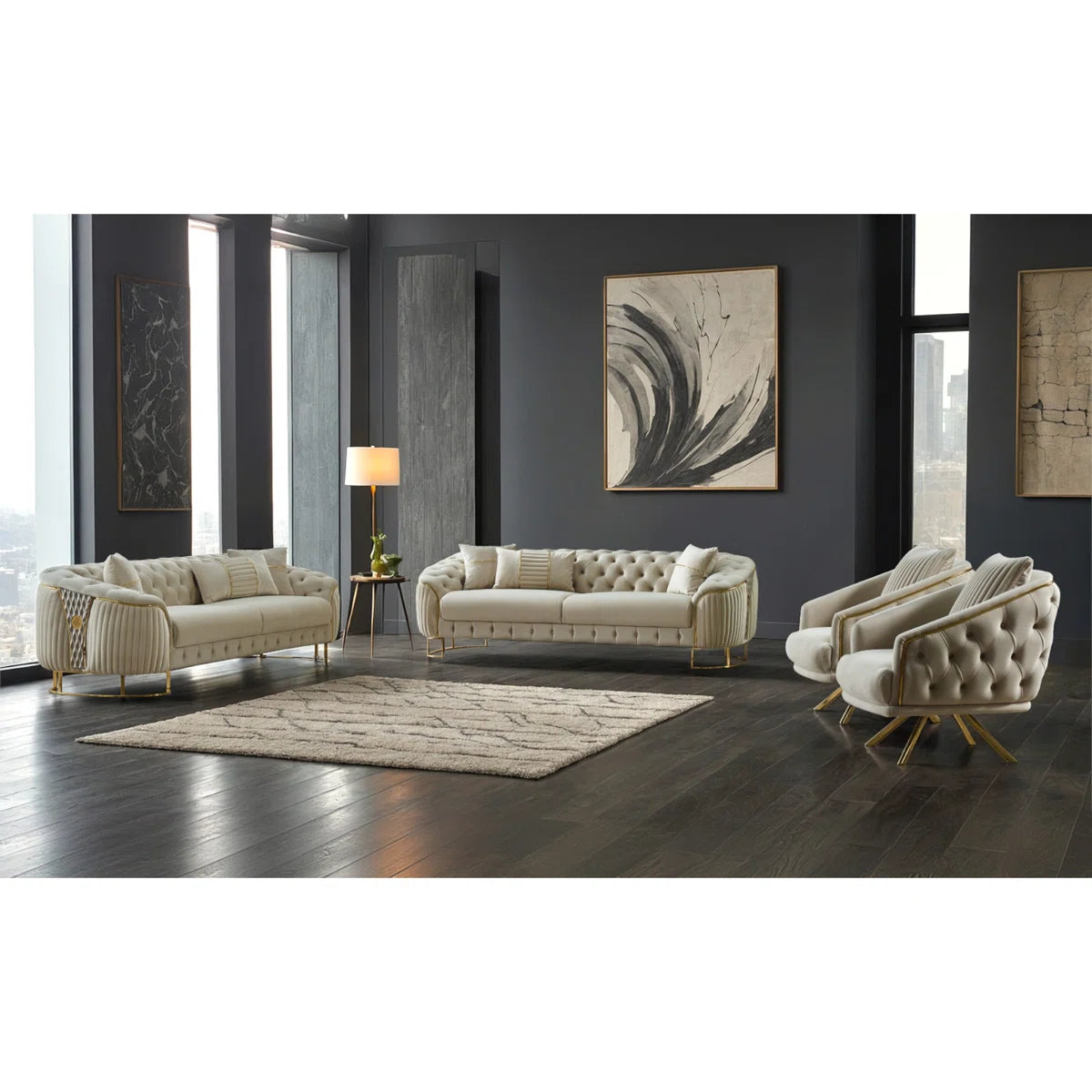Luxury Sofa Sets: 4-Piece Velvet Sofa & Chair Set with Tufted Design and Gold Legs