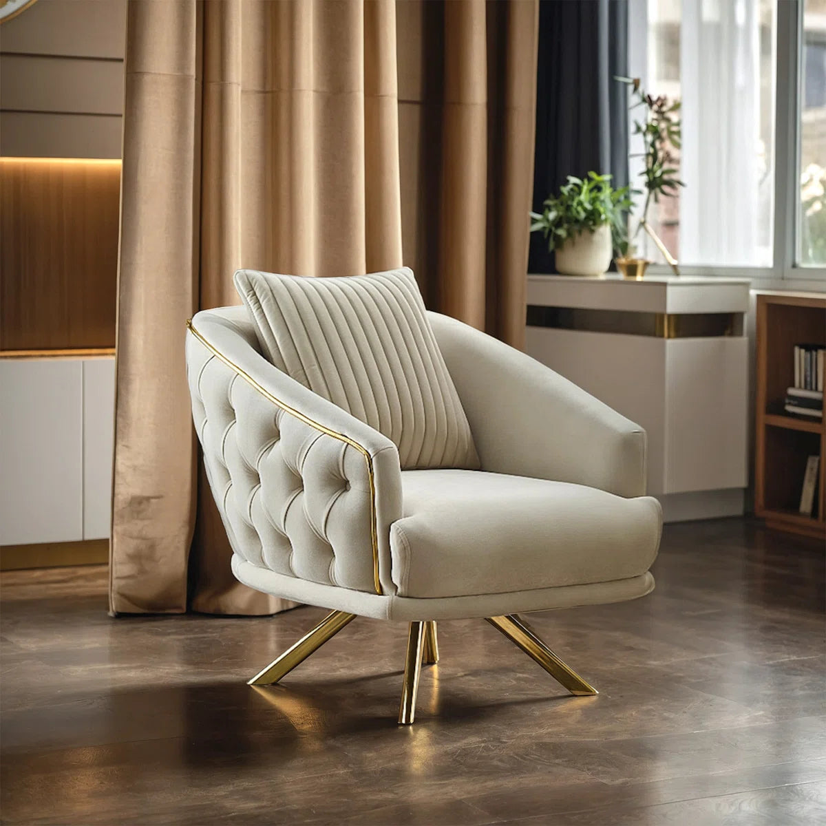 Transform your living space with this luxurious 4-piece living room set that includes two spacious sofas and two elegant chairs. Upholstered in plush cream velvet, each piece features tufted backs, gold-tone metal legs, and a refined silhouette that adds a touch of glamour to any room. Ideal for both entertaining guests and cosy evenings, this set blends timeless elegance with modern comfort. The durable frame, soft foam cushions, and easy-to-clean velvet upholstery make it a perfect fit for Indian homes.