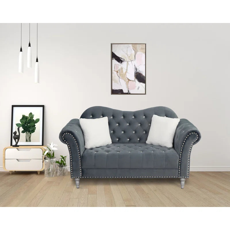 Add a touch of timeless elegance to your living room with this Chesterfield-style luxury sofa set. Upholstered in plush velvet, this set features deep button tufting, rolled arms, and hand-applied nailhead trim for a regal appearance. With its bun feet and gracefully curved backrest, it combines classic ornamentation with luxurious comfort. Includes a sofa, loveseat, and four toss pillows — perfect for elevating your home’s ambience.