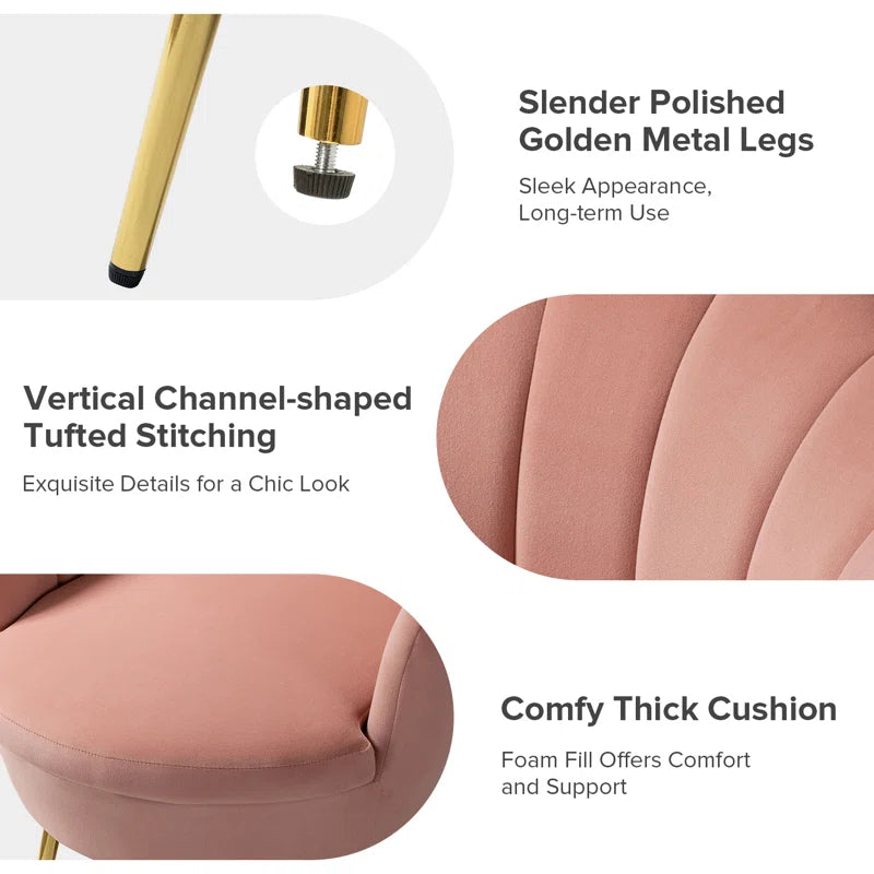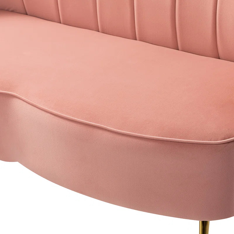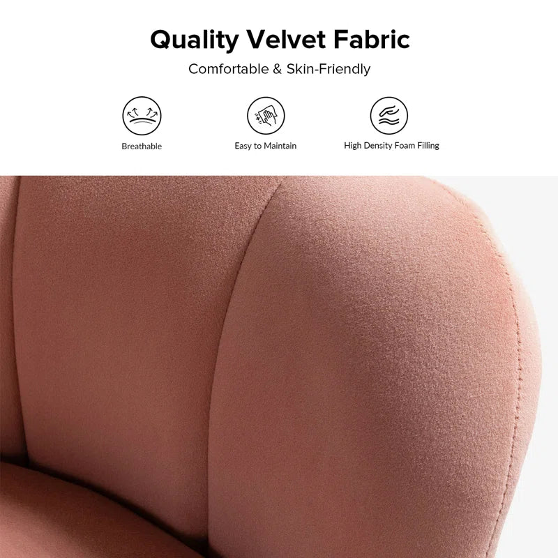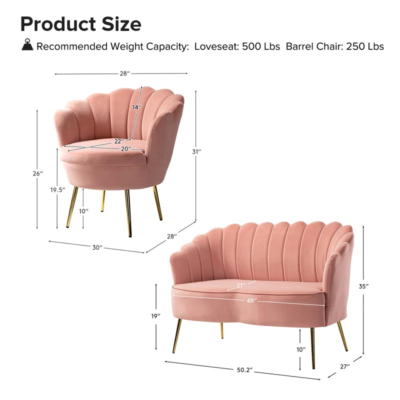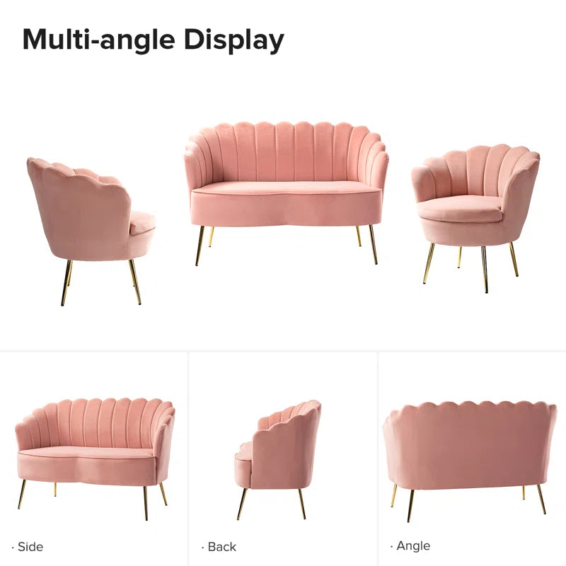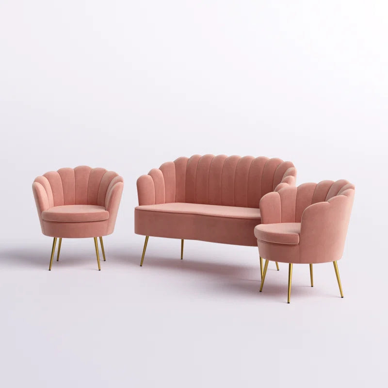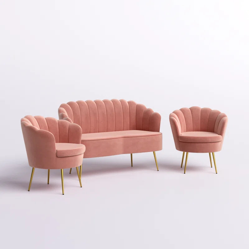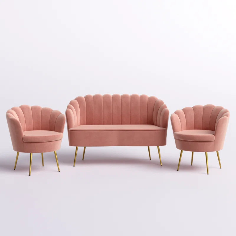 Bring a touch of glamour and elegance to your living space with this 3-piece pink velvet living room set. Featuring a loveseat and two chairs with seashell-inspired barrel backs, this set blends contemporary charm with classic design. The soft velvet upholstery, channel tufting, and gold-finished flared legs give your room a luxe makeover. Built for comfort and style, it’s a charming update for any modern Indian home.