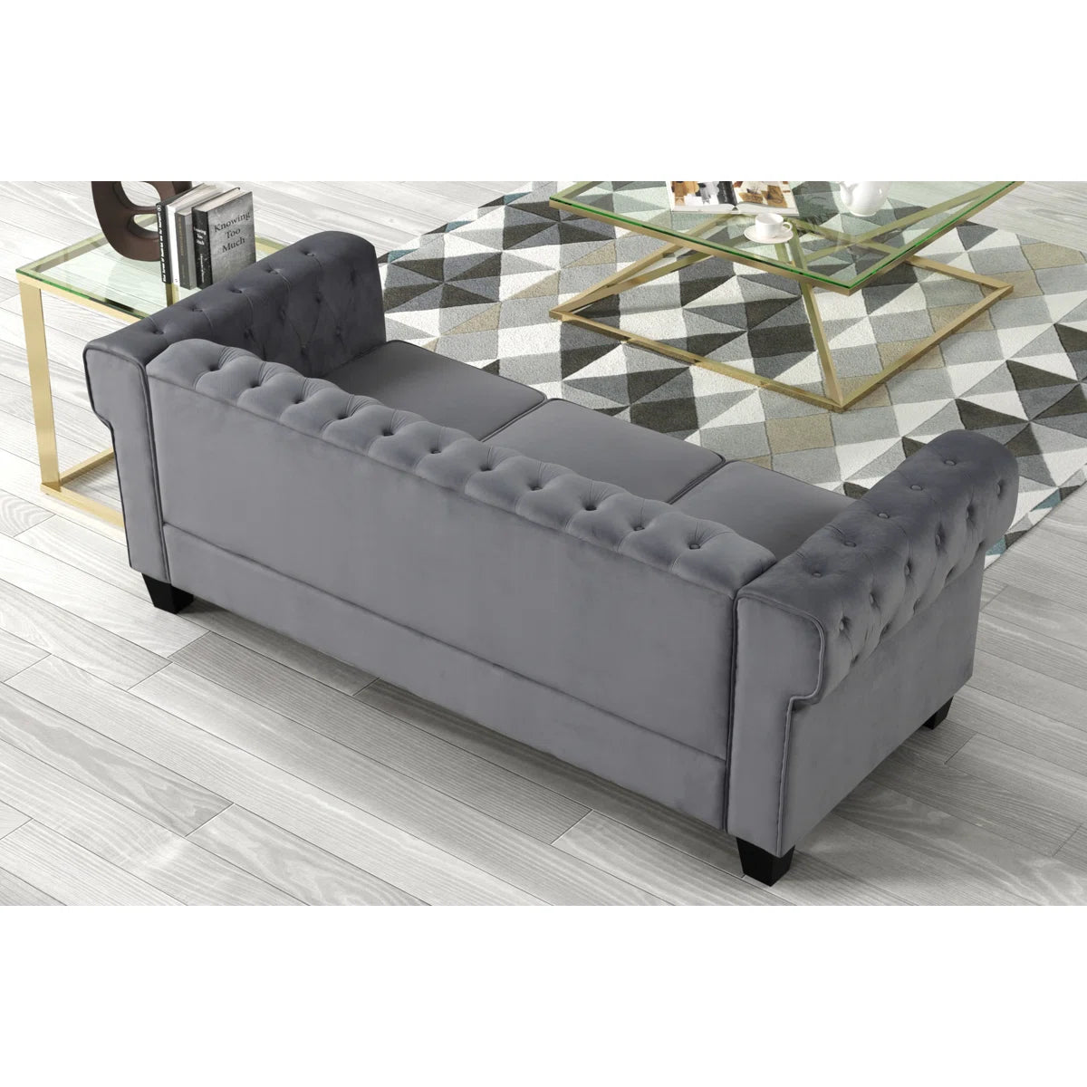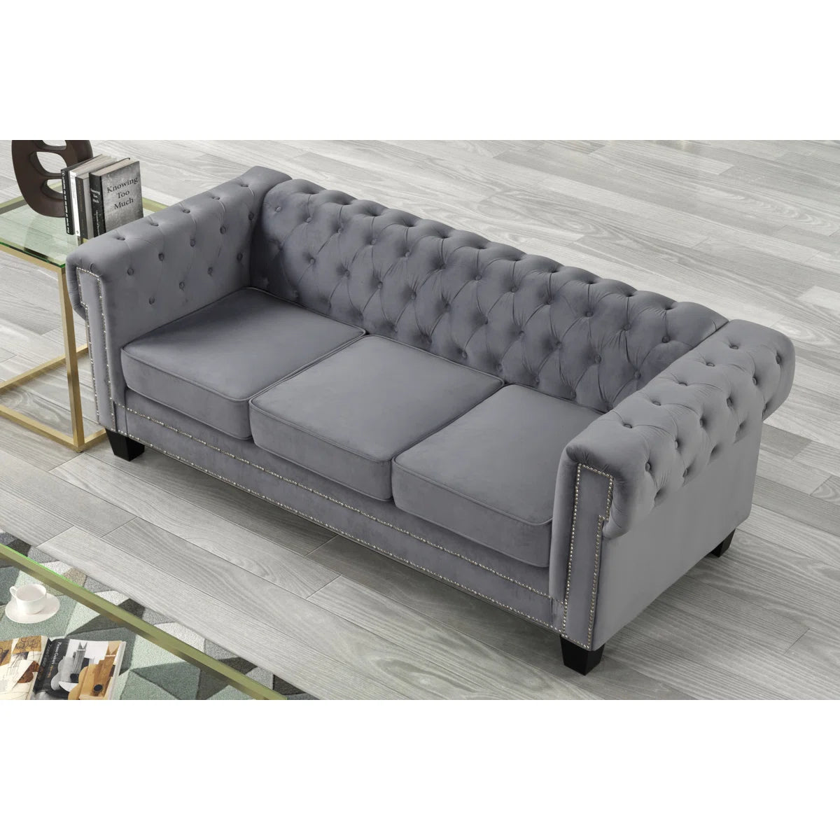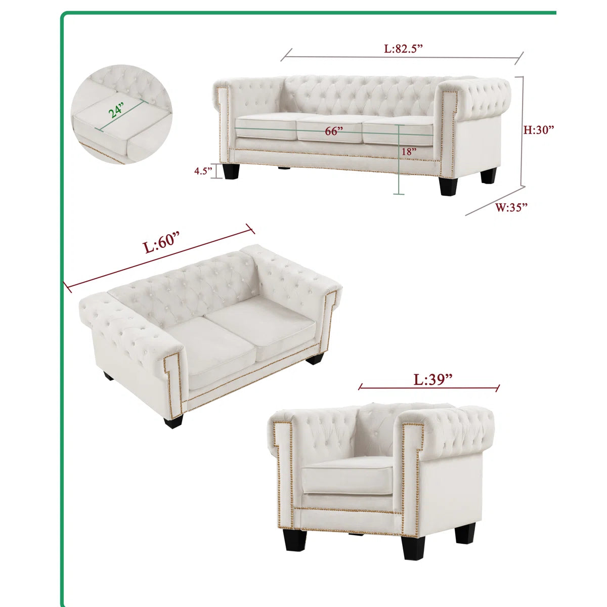 Upgrade your home with this premium Red Barrel Studio® velvet living room set. It includes a three-seater sofa, a two-seater loveseat, and one accent armchair. With soft velvet fabric, button-tufted inner back and sides, and black wood legs, this set blends luxury and modern aesthetics. Designed for both contemporary apartments and classic interiors, it features hidden zippers on cushions for easy cleaning and solid wood legs that resist floor scratches.