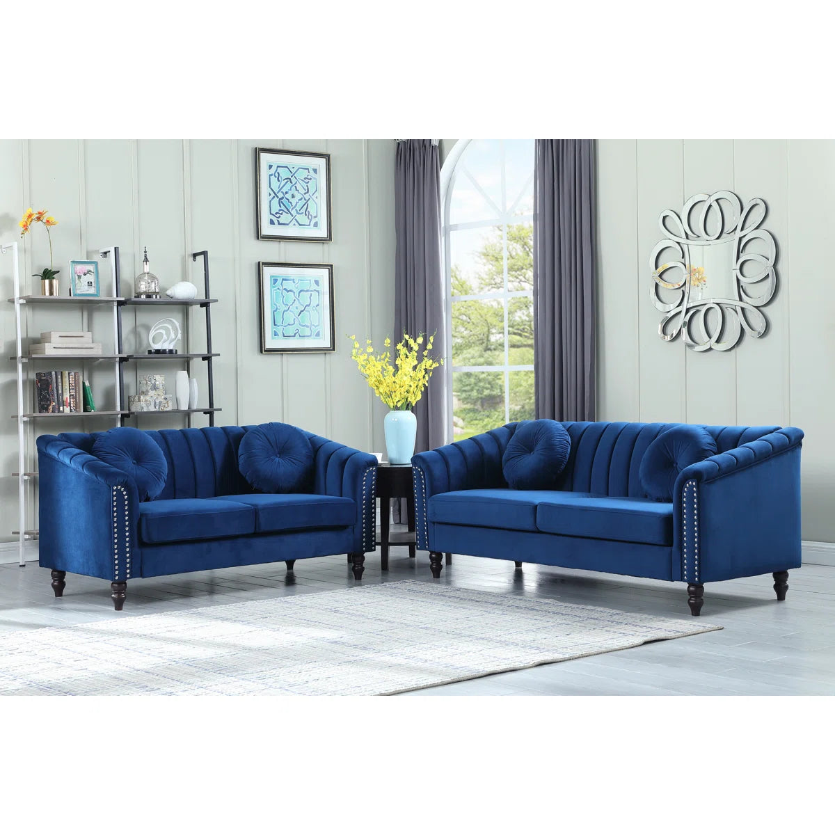 Luxury Sofa Sets: Velvet Fabric 2 Sofas + 2 Loveseats with Ottoman & Cushions – Blue Finish