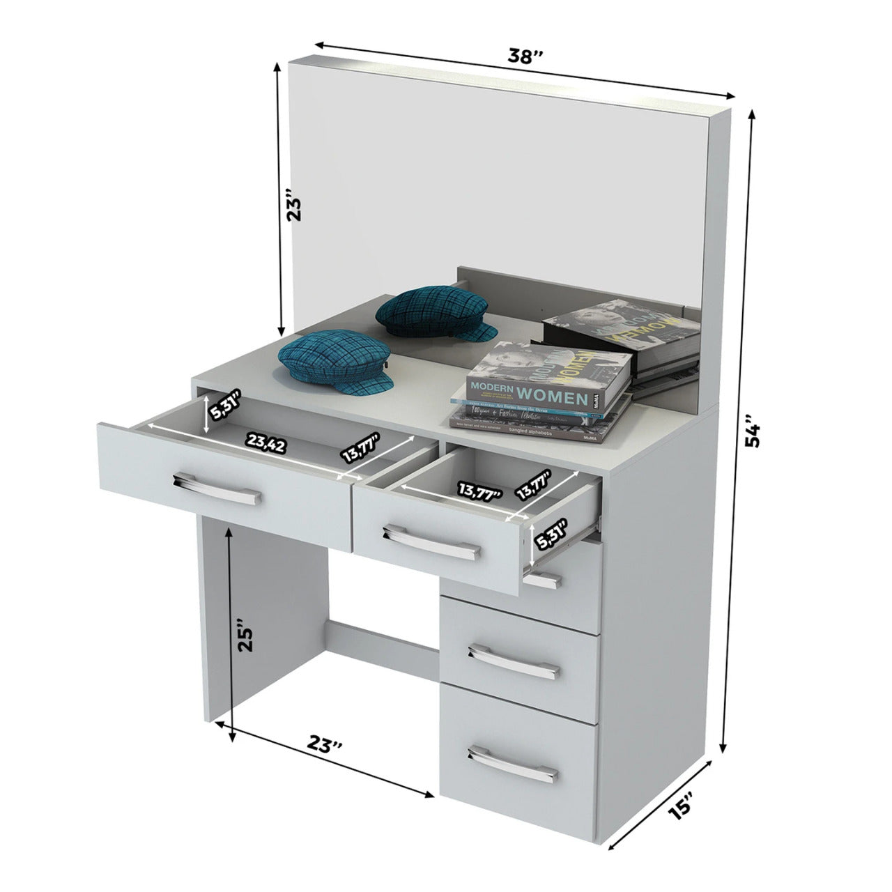 The Makeup Vanity will never let you down with its exceptional quality, useful functions, plenty storage space and stylish look. The Dressing Table comes with a all wide mirror letting you to view yourself in the best way while putting on makeup or doing your hair. There is a central drawer that let you find the important makeup gadgets very easy. In addition you will find four lateral drawer to keep almost everything. The Matilda vanity will let you enjoy your make up time and impress from your co-workers to every friend. It is made from manufactured wood with laminate veneers. Measures 54" H x 38" W x 18" D. Assembly is required.