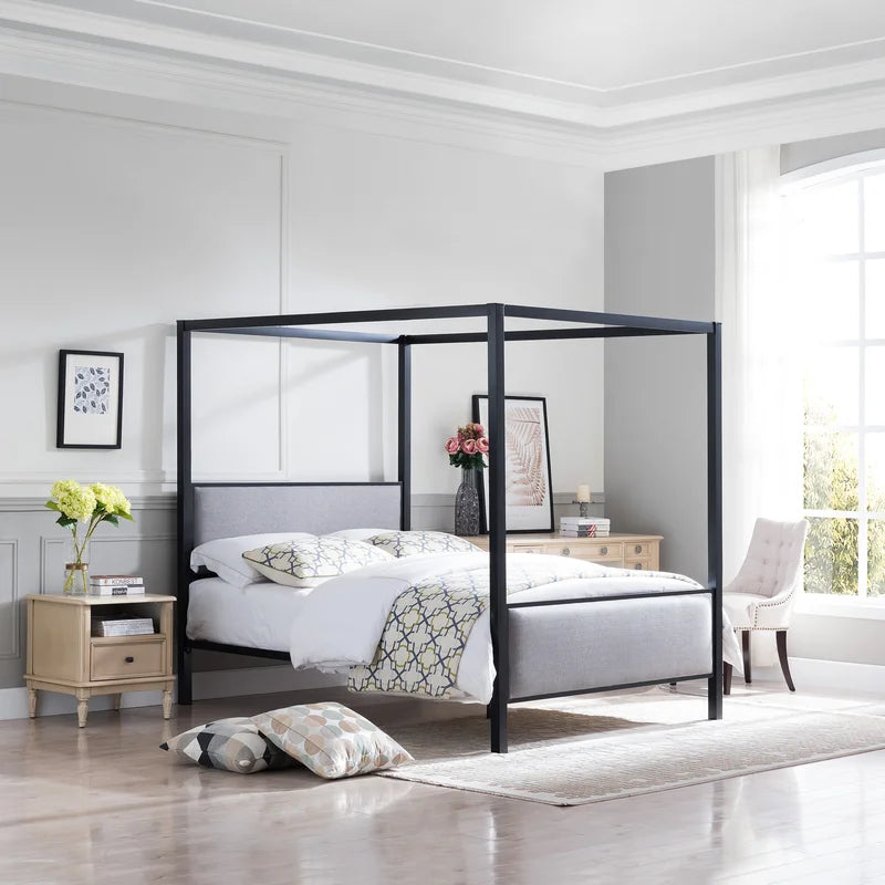 The link refers to a "Canopy Upholstered Poster Bed." This bed has a sumptuous upholstered frame and a canopy design, combining elegance and comfort for a stylish bedroom appearance.