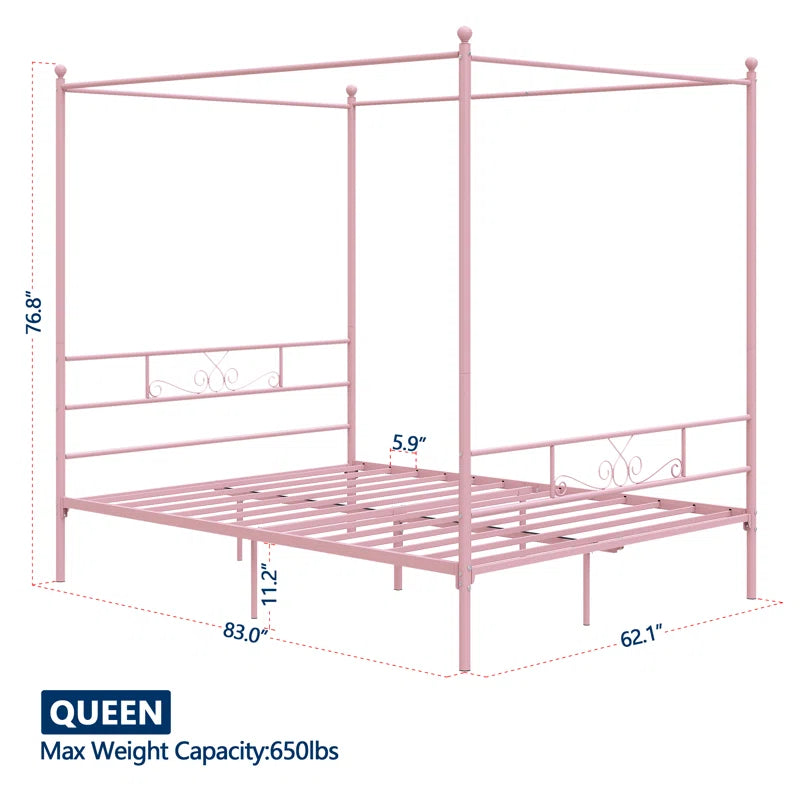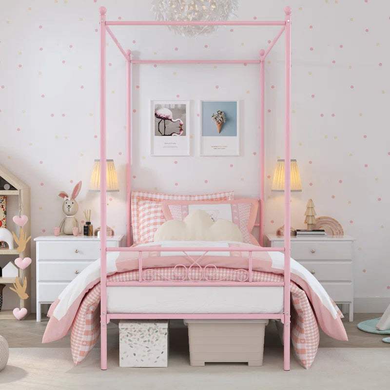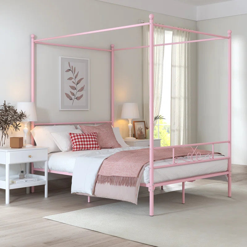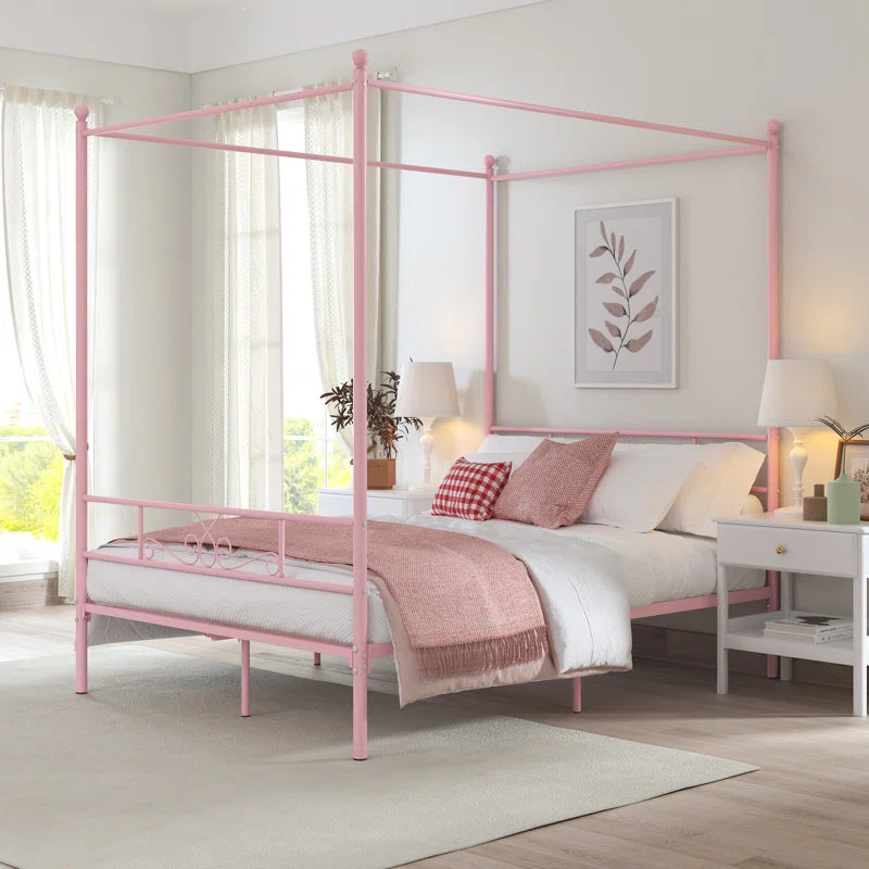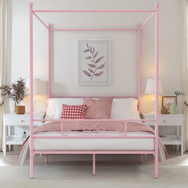 I bought this pink metal frame poster bed and absolutely love the colour and design. It gives a lovely feminine touch to the bedroom, and the frame feels sturdy enough. The assembly process was easy, and it fits well in a smaller room. Definitely a value purchase for the price and adds a modern flair to the space.