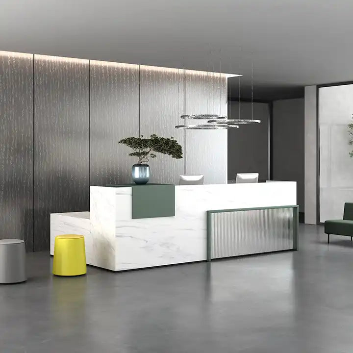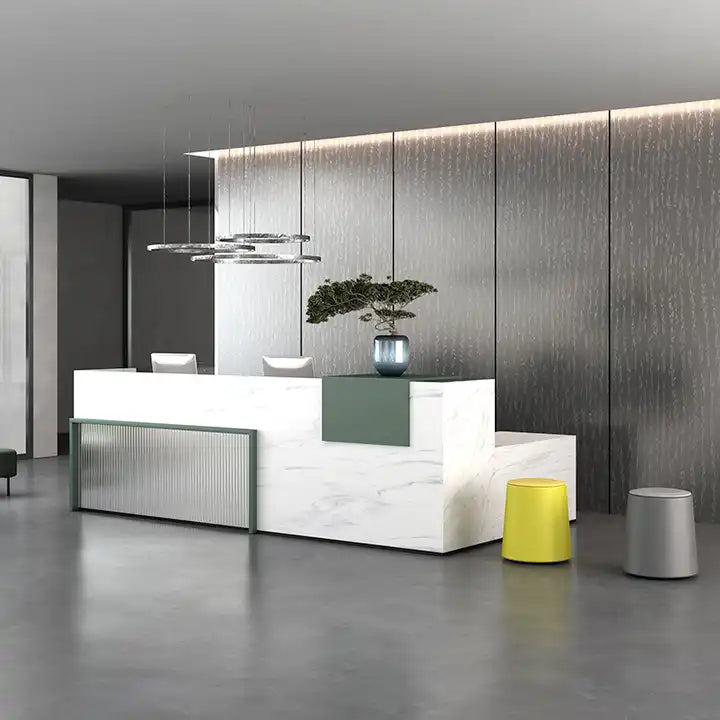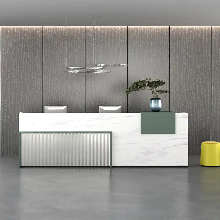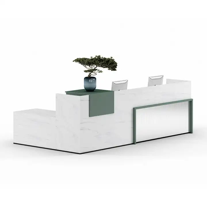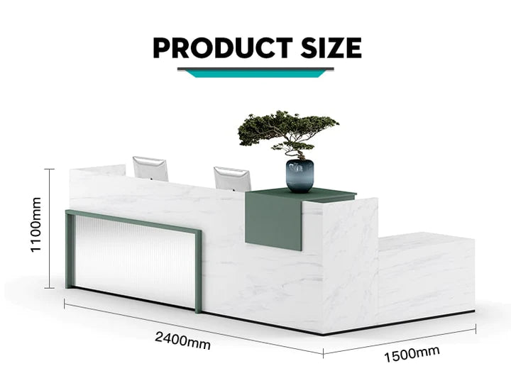 This is a modern reception desk that follows a minimalist design to suit any style of interior decoration you want. Made of high-quality MDF, it is structurally stable, durable, scratch-resistant, and easy to clean and maintain. Equipped with multiple drawers and ample storage space, you can store a large number of documents, books, computers, and other office supplies.