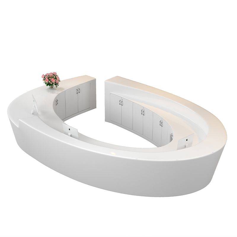 In our business, the contemporary white round reception desk is a chic accent. Its smooth white surface and simple, minimalist design provide a light, airy, and welcoming feeling. It's stylish and useful, ideal for leaving a lasting impression.
