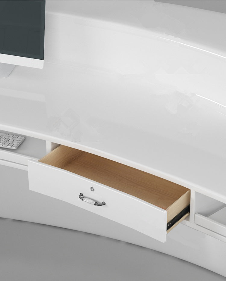 This modern round white desk is perfect for brightening reception areas. Its smooth surface and clean lines create an inviting atmosphere, providing ample workspace for interactions while maintaining a sleek, contemporary look that impresses visitors.