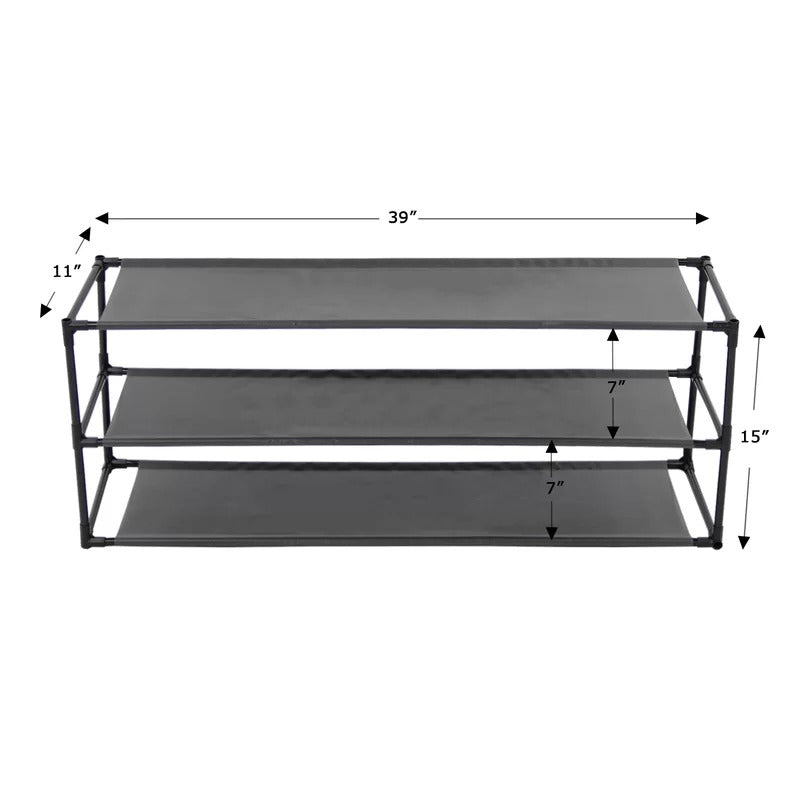 - Waterproof non-woven fabric layer + Sturdy & durable metal tubes + Non-toxic plastic resistant connectors. Stacked 3-tier multi-use shelves for optimized usage in any area of the house. Modern minimalist design is perfect for space improvement. The rack can be placed in small-size areas such as closets as well.