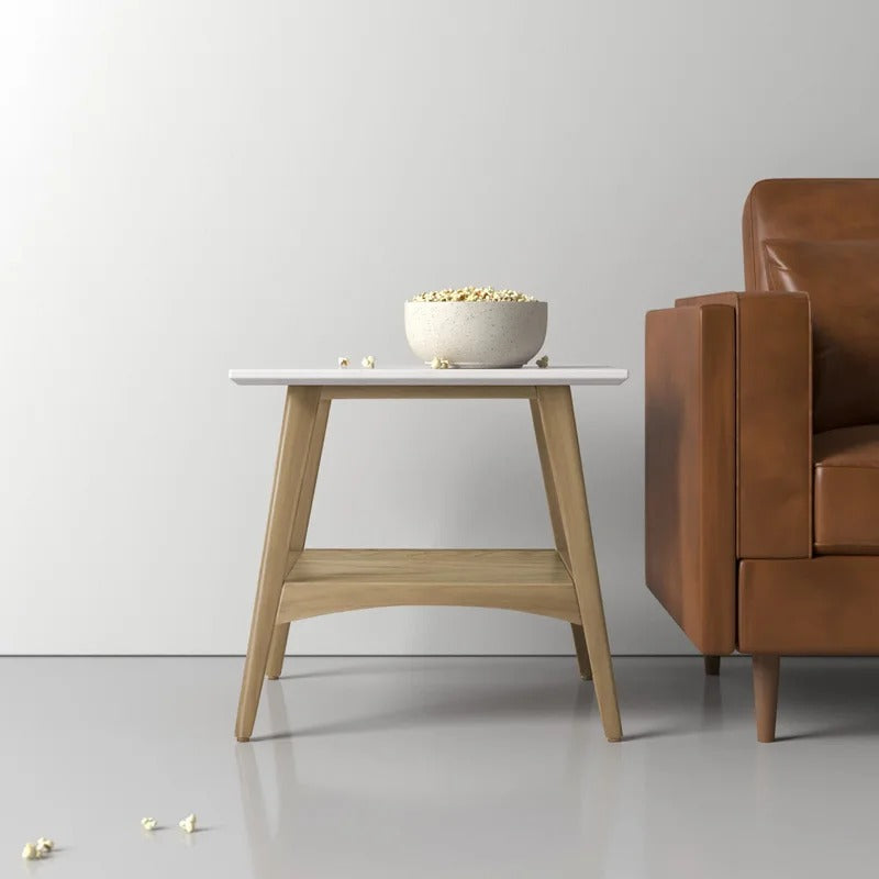 Lend your living room layout a splash of Scandinavian style with this modern end table. Crafted from the manufactured top and solid wood frame, shelf MDF with wood veneer, its frame features flared legs, an open lower shelf, and a warm pecan brown finish for a natural touch. Up above, the square top sports a gloss off-white finish creating contrast. Beyond decorative, this design provides the perfect place to set down snacks, magazines, and the remote as you relax and unwind. Assembly is required.