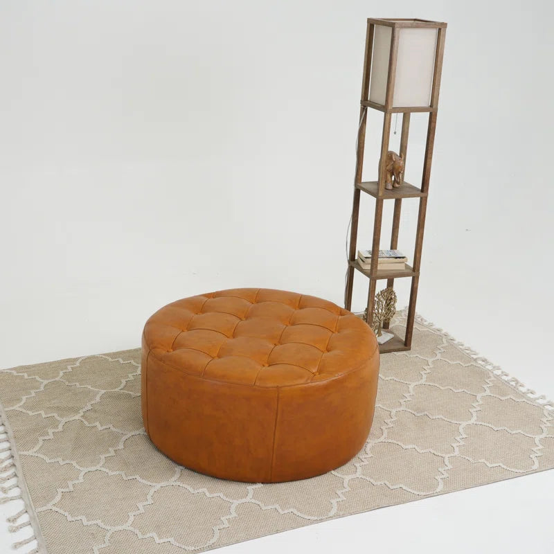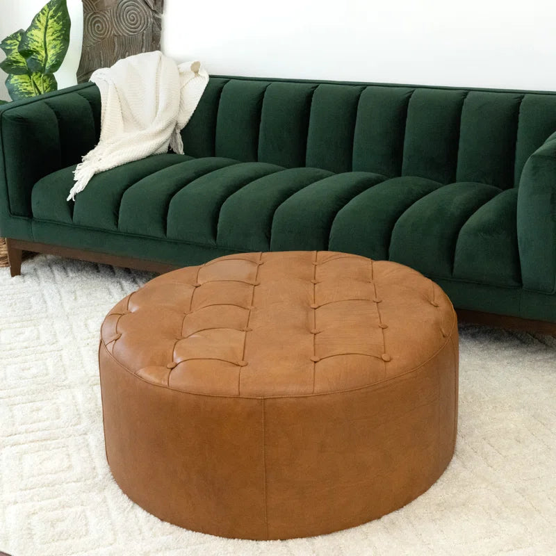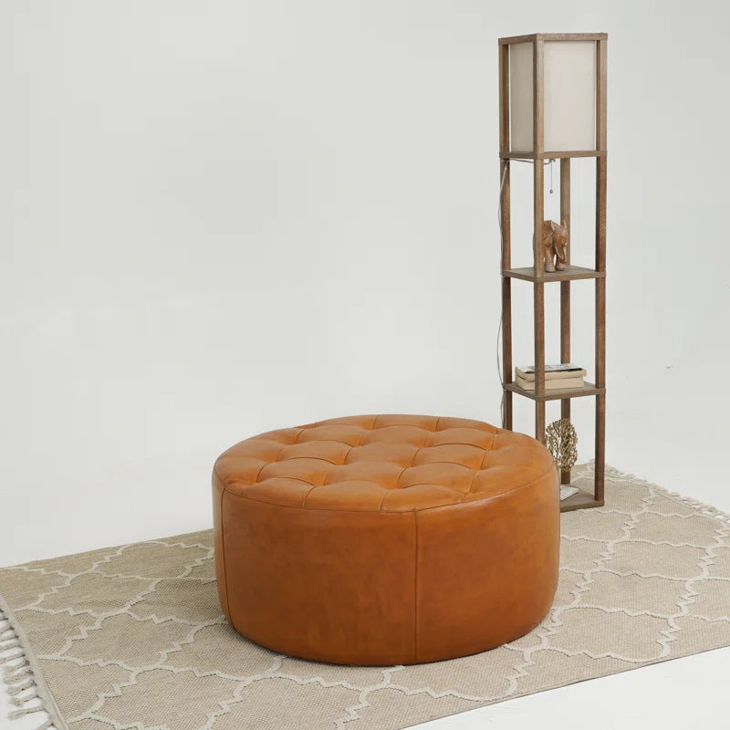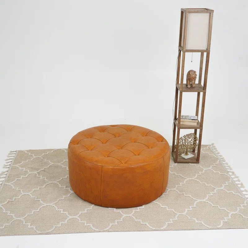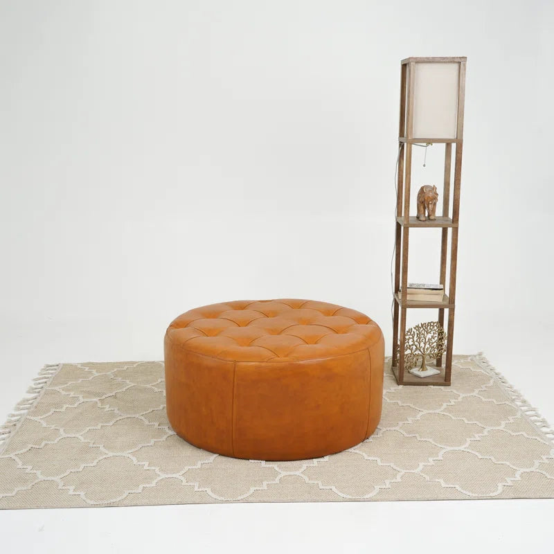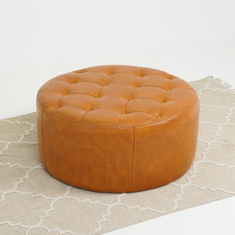 This cocktail Coffee Table/ ottoman completes your glam living room with a sleek, modern look. It's crafted from solid wood in a circular shape padded with foam for padding and support. The design features genuine Leatherette upholstery in a warm tan hue decked out with diamond button tufting. We love that ottomans are so versatile – you can use them to kick up your feet, as extra seating, or even add a decorative tray and create a makeshift coffee table.