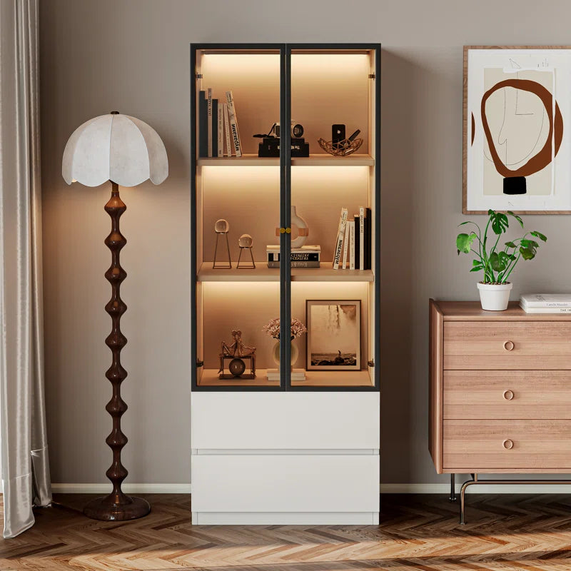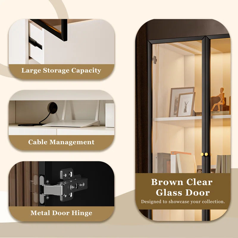 - The entire cabinet set gives you plenty of room to store various kinds. Includes four drawers, one open shelf, three closed shelves, and two storage cabinets. Apart from keeping your books, electronics, and other belongings safe, it may also be utilized to showcase your ornaments, toys, models, wine, and exquisite glass bottles.