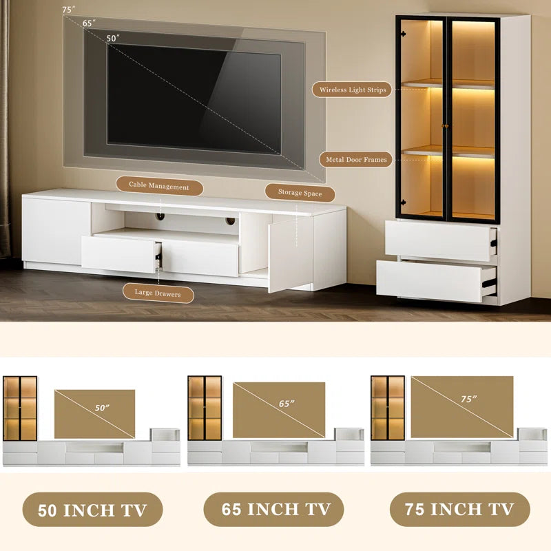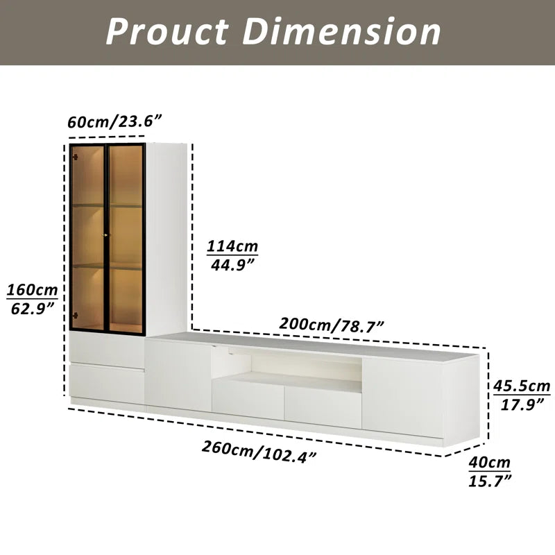 The entire living room set has a sophisticated white design that blends well with both your living room and bedroom's interior decor, particularly when combined with modern accents. A glass cabinet and a tv panel are part of the set. The two divided components can be freely rearranged to fit your available space. The entire set is 102'' long, and the TV cabinet is 78'' long, so it can accommodate TVs that are 75'' and smaller.